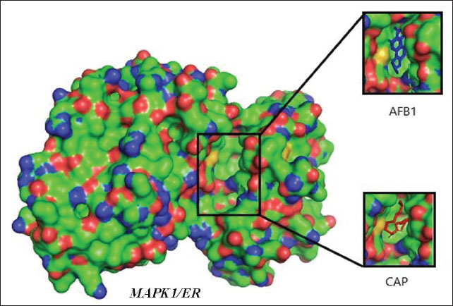 Fig. 2. Visualization of the interaction of the test ligands CAP [marked in red and Aflatoxin (AFB1) (intervening) marked in blue] with the target protein MAPK1/ERK, both of which bind together at the same binding site/cavity. Table 2. Molecular docking test results between MAPK1 and AKT1 target proteins with CAP and Aflatoxin (AFB1).