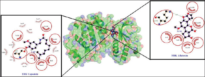 AbstractBackground: Mycotoxins are secondary metabolites produced by fungi that cause serious diseases and death. Among the mycotoxins, aflatoxins stand out for their significant toxic impact, especially Aflatoxin B1 (AFB1) produced by Aspergillus species. Capsaicin, known for its pungent taste, is also highlighted in this study for its potential health benefits, which have been shown to have beneficial effects on the cardiovascular system, metabolism, analgesia, and management of disorders. Aim: This study aimed to determine the in silico inhibition effect of capsaicin on the expression of AKT1 and MAPK1 target proteins in mice due to AFB1 induction. Methods: Molecular docking is a bioinformatics technique that combines biological knowledge with databases (big data) to ascertain the pattern, affinity, and possible activity of chemical compounds interacting with target proteins. When the Gibbs free energy (ΔG) changes, protein-ligand interaction occurs. Results: The findings demonstrated that molecular docking, protein-ligand interactions, homology modeling, target protein prediction, protein interaction analysis, and molecular visualization in silico. The target proteins AKT1 and MAPK1 were highly expressed in the AFB1 binding prediction results in mice (Mus musculus). The tethering of negative Gibbs free energy molecules was deemed satisfactory, and 3D virtual visualization demonstrated excellent adhesion to the receptors of the molecules. Conclusion: Capsaicin can synergistically inhibit regulatory cells through the AKT 1 and MAPK 1 signaling pathways, potentiating the hepatotoxicity action protective effect of capsaicin against AFB-1 intoxication. Therefore, capsaicin is a potential candidate for herbal medicine as a hepatoprotective agent. Keywords: Aflatoxin B1, Capsaicin, Hepatoprotection, Herbal medicine, Good health and wellbeing IntroductionMycotoxins are secondary metabolites produced by fungi that can cause serious illness, including death, in humans and animals (Awuchi et al., 2021). However, some mycotoxins or their derivatives also have pharmacological activity and have been used as antibiotics, growth promoters, and other drugs (Bilal et al., 2023). Aftoxin is one of the most well-known mycotoxins is aflatoxin, which is produced by fungi species of the genus Aspergillus, such as Aspergillus flavus and Aspergillus parasiticus (Shabeer et al., 2022). Aflatoxins are often found in hot and humid climates, especially at temperatures of 27°C–40°C and relative humidity of 85% (Mahato et al., 2019). Aflatoxin B1 (AFB1) and Aflatoxin B2 (AFB2) are the two main forms of aflatoxin formed, while Aflatoxin M1 and M2 are metabolites resulting from the hydroxylation of AFB1 and AFB2 by the cytochrome P450 1A2 enzyme in animals and humans who consume contaminated food (Popescu et al., 2022). After entering the body, AFB1 can activate a series of key proteins that play a role in hepatotoxicity, including various protein kinases such as Glycogen Synthase Kinase 3 Beta (Gsk3b), Mechanistic Target of Rapamycin (Mtor), Epidermal Growth Factor Receptor (Egfr), AKT Serine/Threonine Kinase 1 (Akt1), Mitogen-Activated Protein Kinase 1 (Mapk1), Mitogen-Activated Protein Kinase 3 (Mapk3), and (RAF Proto-Oncogene Serine/Threonine-Protein Kinase) Raf1 (Antonius et al., 2022). The direct interaction of AFB1 with these proteins may trigger the activation of certain genes that potentially increase the risk of liver damage (Marchese et al., 2018). Of the AFB1 target proteins, seven protein kinases have been identified to play important roles in cell pathology (Tran et al., 2024). Alpha kinase threonine 1 (AKT1) is one of the three types of Akt kinases involved in the regulation of metabolism, cell proliferation, growth, and angiogenesis (Benkerroum, 2020). Meanwhile, Mapk1 and Mapk3 proteins, which are serine/threonine kinases, regulate MAP signal transduction, resulting in responses related to cell growth, adhesion, survival, and differentiation (Pearson, 2001). Capsaicin (8-methyl-N-vanillyl-6-nonenamide) is responsible for the spiciness of chili peppers (Wang et al., 2025). When consumed, capsaicin stimulates sensory neurons that transmit pain information to the central nervous system, creating a burning sensation of pain (Alalami et al., 2024). Chilies’ spiciness level depends on the capsaicin and other capsaicinoid compounds, which account for 90% of the total capsaicinoids in chilies (Orellana-Escobedo et al., 2012). Capsaicin has a variety of positive health effects, including analgesic effects, cardiovascular support (McCarty et al., 2015), diabetes management (Szallasi, 2022), gastric protection (Xiang et al., 2022), treatment of urogenital disorders (Shao et al., 2023), and weight loss (Elmas and Gezer, 2021). However, the therapeutic potential of capsaicin in treating respiratory system diseases remains controversial, and the therapeutic effects of capsaicin agonists and antagonists and the role of TRPV1 require further investigation. Among the existing mycotoxins, aflatoxins stand out for their significant toxic impact, especially AFB1 produced by Aspergillus species (Benkerroum, 2020). This research not only focuses on the adverse effects of aflatoxins but also investigates the possibility of developing new therapeutic approaches based on the pharmacological activity profile of mycotoxins. Capsaicin, which is known for its spicy taste, was also highlighted in this study for its potential health benefits (Fattori et al., 2016). Capsaicin improves metabolism, the cardiovascular system, analgesia, and the treatment of illnesses (Thongin et al., 2022). Although capsaicin is often considered a positive compound, this new approach shows that it is important to assess the dual effects of capsaicin, which can be either beneficial or detrimental. This study explores new dimensions in the understanding of mycotoxins and capsaicin and their potential roles in the context of human and animal heal