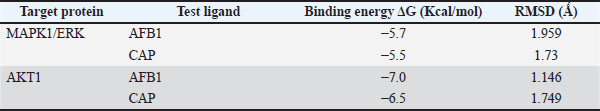 Proteins involved in the apoptotic pathway of cells caused by aflatoxin intoxication are MAPK1 in the MAPK1 signaling pathway and AKT1 in the PI3K/Akt signaling pathway. Aftoxin induces the formation of reactive oxygen species (ROS) and DNA damage in hepatocytes (Zhang et al., 2023). Molecular docking was performed on MAPK1 (ERK) and Akt1 proteins using the Autodock Vina 4.0 program and the CAP and Aflatoxin (AFB1) test ligands as intervening (control variables). The results of molecular docking are Gibbs free energy (ΔG) and virtual 3D visualization results. After performing molecular docking, the process of determining the active side of the protein and the amino acids that will bind to the test ligand (residue) is visualized using Ligplot+ and PyMOL. The quality of the molecular docking test results can be determined by analyzing the binding energy between the target protein and the test ligand using the Gibbs free energy (ΔG) and by analyzing the binding site to determine the interaction between the target protein and the test ligand. The value of ΔG comes from the scoring function with the following equation: S1 (ΔG)=g (c1 − cintra1)=g (cinter1) Where g is a nonlinear function and c is the conformation or interaction caused by intramolecular or intermolecular hydrophobic reactions or hydrogen bonds. If ΔG is negative, the reaction will occur spontaneously, and the affinity of the test ligand to the target protein will be higher (Trott and Olson, 2010). Validation of the molecular docking is that the root mean square deviation (RMSD) value must be less than 2 Ǻ because the smaller the RMSD value, the closer it is to the original binding position of the test ligand (binding pose) with the simulated target protein. If it exceeds 2 Ǻ, the binding pose gets worse, rendering the results invalid. After molecular docking, it was found that CAP binds to AKT1 with a ΔG of −6.5 Kcal/mol, with a ΔG value for Aflatoxin (AFB1) of −7.0 Kcal/mol, with visualization of the binding and binding site in Figure 1. In the test with the MAPK1/ERK target protein (Fig. 2), the ΔG for CAP was −5.5 Kcal/mol and for AFB1 was −5.7 Kcal/mol. All of these ΔGs are very negative, so the reaction will occur spontaneously and cause high affinity for both AFB1 and CAP on the MAPK1/ERK and Akt target proteins, and all RMSD values for the four tests are below <2 Ǻ (Table 2).