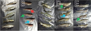 Fig. 1. Clinical symptoms of Aeromonas hydrophila infection in zebrafish: negative control group (A), positive control group (B), T1 group (C), T2 group (D), and T3 group (E). Notes: hemorrhage (red arrows), abdominal distension (blue arrows), paleness (green arrows). Fish mortalityThis study showed a mortality rate of 0% in the negative control group and 18% in the positive control group. Meanwhile, mortality rates in groups T1, T2, and T3 were 16%, 20%, and 13%, respectively. Mortality rates in the T1 and T3 groups were lower compared to the positive control, whereas the T2 group showed a higher mortality rate than the positive control, T1, and T3. Confirmation of intestinal floraIsolation and identification results showed the presence of Lactobacillus sp. Bacterial isolation revealed the presence of A. hydrophila, Staphylococcus aureus, Pseudomonas aeruginosa, and Lactobacillus sp. in all groups except the negative control group, in which A. hydrophila was not detected. The presence of Lactobacillus sp. in all groups indicates the presence of normal gut flora. In vitro disk diffusion assayThe results showed that coconut oil at all tested concentrations (25% to 100%) did not inhibit the growth of A. hydrophila in Figure 2. Protein profileBased on Figure 3, major protein bands with significant intensity were observed at molecular weights of 85–90 kDa in all treatment groups and at 27.2–38 and 44–48 kDa in the positive control, T1, T2, and T3 groups.
