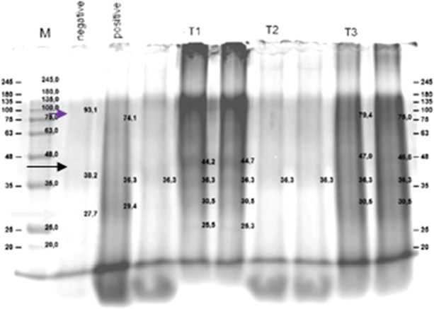 Fig. 3. Protein profile of fish after treatment with coconut oil and infection with Aeromonas hydrophila in all treatment groups. Protein profiles from five groups (negative control, positive control, and three coconut oil doses: 1,000, 2,000, and 4,000 mg/kg feed) are shown using SDS-PAGE, as indicated by arrows. DiscussionThe coconut oil analyzed in this study using gas chromatography flame ionization detector revealed a lauric acid (C12:0) content of 48.96%. Other identified fatty acids included myristic acid (C14:0, 19.50%), palmitic acid (C16:0, 9.04%), caprylic acid (C8:0, 6.39%), capric acid (C10:0, 5.48%), oleic acid (C18:1, 5.80%), and stearic acid (C18:0, 2.79%). Overall, the coconut oil contained 92.85% saturated fats and 1.24% linoleic acid. The high concentration of lauric acid is believed to be closely related to the oil’s immunomodulatory potential and antimicrobial properties. Lauric acid (Suryani et al., 2020) and its monoglyceride, monolaurin, have been reported to possess antimicrobial activity against various Gram-positive and Gram-negative bacteria (Joshi et al., 2020). However, the results of this study demonstrated that coconut oil at concentrations ranging from 25% to 100% did not produce any inhibition zones against A. hydrophila. This suggests a lack of bacteriostatic effect. The inability of coconut oil to inhibit A. hydrophila may be attributed to the bacterial outer membrane, which acts as a barrier against hydrophobic compounds (Vergalli et al., 2020), such as the fatty acids present in coconut oil. This finding is consistent with the statement by Sharma et al. (2019), who explained that the outer membrane and efflux pumps of Gram-negative bacteria hinder the penetration of lauric acid. Although lauric acid is known for its antimicrobial activity against certain pathogens, it appears ineffective against A. hydrophila. It is possible that A. hydrophila possesses an efficient efflux system capable of expelling antimicrobial compounds (Awan et al., 2018). Coconut oil has also been reported to have antifungal activity against Candida albicans (Divyadharsini et al., 2022), indicating that antimicrobial effectiveness can vary depending on the pathogen species. Other factors that may contribute to the lack of antibacterial activity of coconut oil can be classified into two groups. (a) Variations in the fatty acid composition of the coconut oil used, which can influence its antimicrobial activity (Casillas-Vargas et al., 2021), and (b) experimental conditions such as temperature, pH, and incubation time, which may also affect the efficacy of coconut oil as an antimicrobial agent (Yoon et al., 2018). According to Shilling et al. (2013), combining coconut oil with other compounds enhances its inhibitory effects against Gram-negative bacteria. However, this study did not employ any additional combinations. Interestingly, in infected zebrafish, the administration of coconut oil significantly reduced mortality in T1 and T3 groups compared to the untreated group. Mellouk et al. (2024) reported that supplementation with glycerides of lauric acid in poultry enhanced both humoral and cellular immune responses against viral infections, including increased macrophage activation, IFN-γ secretion, and T lymphocyte differentiation into T-helper 1 and Th17 pathways. These mechanisms are closely linked to the upregulation of Tool-Like Receptor 4 and Nuclear Factor kappa-light-chain-enhancer of activated B cells pathways, as well as the expression of pro-inflammatory cytokines such as IL-12 and IL-6, which are important in defense against Gram-negative bacteria such as A. hydrophila. Moreover, in the insect model Drosophila melanogaster, lauric acid and other eicosanoid precursors such as linoleic acid have been shown to enhance antimicrobial peptide (AMP) production and the phagocytic activity of hemocytes, which are functional analogs of macrophages in vertebrates (Azizpor et al., 2024). In this study, A. hydrophila, S. aureus, P. aeruginosa, and Lactobacillus spp. were detected in the fish. The presence of A. hydrophila in all treatment groups confirms that the pathogen was not eliminated, yet the lower mortality rates in T1 and T3 suggest a non-bactericidal mechanism of action. Although coconut oil did not eradicate A. hydrophila from the gastrointestinal tract, it is presumed to have contributed to enhancing the stability of the normal gut flora (Lactobacillus spp.) or reducing the virulence of A. hydrophila, as evidenced by the decreased mortality. Nearly all groups exhibited colonies of lactic acid bacteria, primarily Lactobacillus spp. Notably, group T1 showed the highest count of lactic acid bacteria (CFU/g) (3.02 ± 0.07), compared to T2 (1.38 ± 0.05) and T3 (1.21 ± 0.03) (data not published), suggesting a more stable gut microecosystem in this group. Such microbial stability likely supports the non-specific immune system and inhibits the colonization of opportunistic pathogens such as Pseudomonas and Staphylococcus, thereby reducing fish mortality. Ullah et al. (2025) reported that glycerol monolaurate, a derivative of lauric acid also found in coconut oil, significantly enhanced intestinal integrity, goblet cell numbers, and claudin-1 gene expression, as well as improved the gut microbiota diversity in Acanthopagrus schlegelii. Similar findings were reported by Li et al. (2023), who demonstrated that dominant flora such as Lactobacillus spp and Bifidobacterium spp. can suppress pathogen colonization, reduce pro-inflammatory cytokine production, and maintain gastrointestinal homeostasis through immune modulation along the gut-brain axis. Lauric acid may disrupt bacterial membrane integrity, inhibit virulence enzymes, and stimulate the release of AMPs via activation of TLR and NF-κB pathways (Di Vincenzo et al., 2024). Additionally, this fatty acid can promote mucin expression and strengthen epithelial tight junctions, contributing to gut barrier enhancement (Seo et 