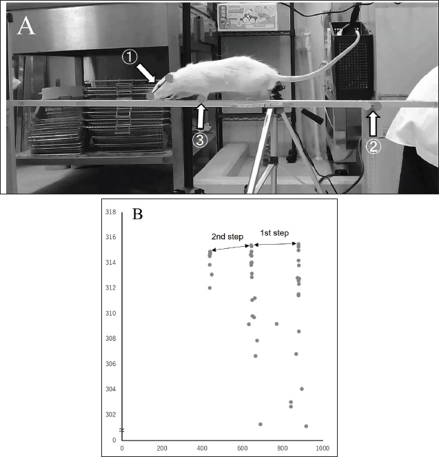 Fig. 2. Lateral image. A: The head inclination angle was estimated from the line connecting the nose and ear canal (A①) and the line connecting two points on the tape (A②). The stride length was calculated from the forelimb heel (A③). B: The stride length was estimated from the coordinates of the observation points obtained using the DLC. The right lateral view was recorded with the same settings as the left lateral view; however, it was used to assess the number of foot slips and task completion time. A clock was included in the right lateral images and was also captured in the frontal images, allowing the identification of the time it took the animal to traverse the measurement section in the frontal view. Top images (Fig. 3)The observation points were set at approximately the midpoint of the line connecting the tips of the nose and both ears and at the base of the tail. The head inclination angle was estimated using the line connecting the midpoint between the nose and both ears (Fig. 3-①) and the line connecting the two observation points on the beam projected horizontally on the screen (Fig. 3-③). Similarly, the trunk inclination angle was estimated using the line connecting the midpoint between both ears and the base of the tail (Fig. 3-②), along with the line connecting the two points on the beam (Fig. 3-③).