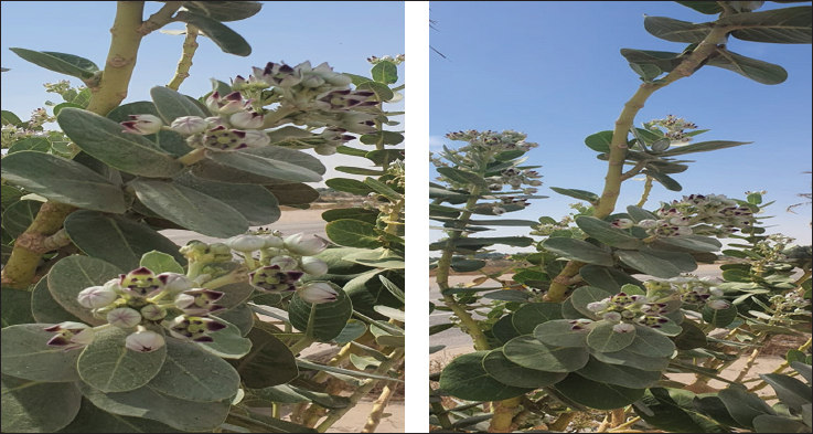 Fig. 1. The Calotropis procera The entire fresh plant of C. procera was oven-dried at 60°C and then ground to a coarse powder using a mechanical grinder using samples that were gathered from the Al Hasa Region of Saudi Arabia. Merck is the supplier of the extraction solvent, dichloromethane (DCM) analytical reagent grade, and ethanol grade (purity 99%). Silica gel 60 mesh, GF254 silica gel plate for thin layer chromatography (TLC) analysis, and Florisil (a U.S. Silica Company trademark) for column chromatography. For GC/MS analysis, a DB-5MS capillary column and 99.9999% pure helium will be utilized. Extraction methodLiquid maceration extractionThe fresh whole dried C. procera plant (500 g) was homogenized at room temperature with 2,000 ml of two different polarity solvents (ethanol and DCM) (Merck) in a rotary mixer set at 45°C and 200 rpm for 48 hours. The extracts were then filtered through filter paper Whatman No. 4, and all of the solvents were evaporated under a vacuum using a rotary evaporator to produce crude extracts that were stored at 30°C for analysis. GC/MS method of analysisPhytochemical profiling of C. procera was performed at the Central Laboratory, Clinical Science Department, College of Veterinary Medicine, King Faisal University, utilizing a Shimadzu (GCMS-QP2010) gas chromatography/mass spectrometry system (Shimadzu, Japan). Utra-high purity helium (He) gas, a grade of 99.9999 % was used as the mobile phase at a constant flow rate of 1.5 ml/minutes. The system was fitted with a DB-5MS capillary column (30 m, 0.25 µm film thickness). A 1 µl of the sample was introduced into the split/splitless injector operating in splitless mode at 260 °C. The interface temperature between the GC/MS units was 220°C. The temperature program was started at 80 °C, followed by 10°C/minutes up to 240°C, with the final temperature held for 20 minutes. Mass spectral data were collected in scan mode within the 50–550 µ range (El Sherif et al., 2020). Fractionation by TLCThin layer chromatography (TLC) silica gel 60 F254 (20 cm × 20 cm) 25 ct (Merek, Italy). The primary active ingredients of medicinal plants, such as alkaloids, cardiac glycosides, coumarins, flavonoids, saponins, and tannins, can be quickly investigated using TLC, a chromatographic technique with a layer thickness of 0.25 mm. According to Suresh kumar (2021), the TLC spot is measured to ascertain the amount of material present. For each dry extract, the spot volume applied to the chromatographic TLC plates was 5 μl or 300 μg. Starting with a nonpolar solvent (100%) and increasing the polarity by combining ethyl acetate to attain the optimal separation (70:30) hexane: ethyl acetate, TLC is carried out in the following solvent systems. The spots were first examined under UV 254 nm and UV 365 nm light without any chemical treatment. After that, the plates were heated to 110°C for 15 minutes to produce a pink spot for chemical organic compounds, and the plates were submerged in a freshly made mixture of vanillin (3 g), 50 ml of ethanol, and 0.5 ml of sulfuric acid. Proximate composition, phytochemical analysis, and TLCThe contents of ash, moisture, crude protein (calculated as nitrogen × 6.25), crude fat, crude fiber, and starch were analyzed using a FOSS, FoodScan near-infrared (NIR) spectrophotometer, employing the FOSS Artificial Neural Network Calibration Model and its associated database. The analyses were according to AOAC (2006). All proximate analyses were performed as percentages on a dry weight (dw) basis. Phytochemical analysisThe fresh dry plant of C. procera was analyzed for its phytochemical constituents at the Central Laboratory, Clinical Sciences Department, Faculty of Veterinary Medicine, King Faisal University. The extract was evaluated for the presence of terpenoids, alkaloids, flavonoids, tannins, phenols, and saponins with standard colorimetric methods described by Sofowora (1993) and Kennedy and Thorley (2000). ResultsThe proximate analysis for leaves and fruits indicated that both leaves and fruits of C. procera contain valuable nutrients such as crude protein which ranges from 18.21% to 21.3%, crude fat from 3.95 to 4.12, starch from 34.65% to 41.23%, and crude fiber from 18% to 18.65% approximately (Table 1). Table 1. Proximate composition (%) of (C. procera) leaves and fruits.