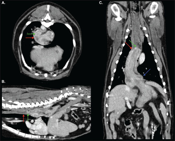 Fig. 1. Transverse (A), sagittal (B) and dorsal (C) images from the venous-phase acquisition. Part of the gastric fundus (green arrow) has herniated cranially through the oesophageal hiatus into the caudal thoracic oesophagus (red arrow). The gastroesophageal junction (blue arrow) remains in a normal position. The more proximal thoracic oesophagus is mildly distended by a small volume of heterogeneous, intraluminal, fluid-and-soft-tissue-attenuating material. Findings are consistent with gastroesophageal intussusception.