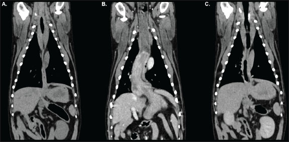 Fig. 2. Dorsal reconstructions of the thorax and cranial abdomen acquired during pre-contrast (A), venous-phase (B), and delayed post-contrast (C) phases of the study. The stomach is appropriately positioned with minimal distension of the oesophagus in the pre-contrast (A) and delayed (C) acquisitions. Gastroesophageal intussusception is identified during the venous-phase acquisition (B) as outlined in Figure 1.