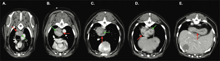 Fig. 3. Transverse-plane images of the thorax from the venous-phase acquisition at approximately the level of the T4 (A), T5 (B), T8 (C), T9 (D), and T10 (E) vertebrae. The gastric fundus (green arrow) has herniated cranially through the oesophageal hiatus into the caudal thoracic oesophagus (red arrow). Note that unlike in cases of hiatal herniation, the distal oesophageal walls are visualised surrounding part of the gastric fundus, creating a target-like appearance, indicative of intussusception. An osteoaggressive, markedly vascular, and locally invasive caudal retroperitoneal mass was identified arising from the right iliopsoas muscle and extending ventral to the L4–L7 vertebrae. The caudal vena cava contained an extensive intraluminal, soft-tissue attenuating filling defect, and marked proximal right pelvic limb muscular atrophy was identified, indicating tumour thrombi and neurogenic atrophy, respectively. Other incidental computed tomography findings included hepatic/biliary cysts, chronic renal infarcts, cystic left hepatic lymphadenopathy, spondylosis deformans, shoulder and stifle osteoarthrosis, a left thyroid nodule, a small right thyroid, bronchial plugging indicative of chronic inflammatory disease, and nasal changes consistent with chronic inflammatory rhinitis. Gastric changes were consistent with transient, self-resolving GEI. This may represent a one-time, spontaneous GEI, possibly triggered by iohexol-induced nausea (Sanderson, 2005), anaesthesia-associated lower oesophageal sphincter laxity (Van Geffen et al., 2006), or a combination thereof. Alternatively, the finding may reflect incidental capture of a chronic, intermittent GEI that is unrelated to intravenous contrast or anaesthetic administration. If this is the case, the intussusception could represent a progression or exacerbation of the previously documented hiatal hernia, or could represent a separate, concurrent, intermittently occurring disease entity. The sublumbar mass arising from the iliopsoas was suggestive of malignant neoplasia. Differential diagnoses included haemangiosarcoma or a neuroendocrine tumour. Ultrasound-guided fine-needle aspirates were obtained. Cytological review was performed by a specialist veterinary pathologist, revealing individual and clustered, hyperchromic, pleomorphic spindle cells with moderately basophilic cytoplasm, variable punctate vacuolation, intracellular haemosiderin, scant mitotic figures, and large nuclei containing stippled chromatin and prominent nucleoli, consistent with a right iliopsoas haemangiosarcoma. No treatments were considered necessary for the spontaneously resolved gastroesophageal intussusception because signs of gastrointestinal disease had not been reported. The sublumbar mass was deemed inappropriate for surgical resection due to its extent and invasiveness. A poor prognosis was given. Various chemotherapeutic options and palliative radiation therapy were discussed, but the patient’s owners declined further treatment. The patient was discharged the following morning to continue his ocular medications, insulin, appetite stimulants, antinausea medications, and ongoing pain relief. The patient’s owners reported a clinical deterioration in the form of whimpering, panting, hotness to the touch, and pelvic limb weakness when toileting 1 day after discharge. 3 days later, the patient presented to another 24-hour specialist facility having died at home. No postmortem investigations were conducted. DiscussionGastroesophageal intussusception is defined as the retrograde translocation of all or part of the stomach into the thoracic oesophageal lumen (Shibly et al., 2014). In some cases, other organs, including the duodenum, omentum, spleen, and pancreas, may invaginate alongside the stomach (Rowland and Robinson, 1978; Roach and Hecht, 2007; Emery et al., 2015; Brady et al., 2017; Grimes et al., 2020). Importantly, in cases of GEI, the gastroesophageal sphincter maintains a normal position; this distinguishes it from axial or sliding hiatal hernias, in which the gastroesophageal junction is cranially malpositioned in the thorax, as outlined by Leib and Blass (cited in Grimes et al., 2020). GEI has historically been considered to most commonly occur in young, large-breed dogs (von Werthern et al., 1996; Rowland and Robinson, 1978; Moore, 2008; Grimes et al., 2020). Male German Shepherds are particularly over-represented and may be predisposed; A 2020 retrospective study found that dogs suffering from GEI had a median age of 13.2 months, were male in 72% of cases, and were German Shepherds in one-third (33%) of cases (Grimes et al., 2020). There are, however, reports of GEI in older dogs (Pietra et al., 2003; Kaewamatawong et al., 2010; Brady et al., 2017; Rohwedder & Hellmuth, 2021), female dogs (Greenfield et al., 1997; McGill et al., 2009; Kaewamatawong et al., 2010), cats (Van Camp et al., 1998; Van Geffen et al., 2006; Abbaszadeh Hasiri et al., 2013; Martinez et al., 2001; Tayler et al., 2021) and a variety of other breeds, including Australian Shepherd (Shibly et al., 2014), Siberian Husky (Greenfield et al., 1997; McGill et al., 2009; Takeuchi et al., 2021), Briard (Walker and Ryan, 2017), Pug (Pietra et al., 2003), Labrador (Graham et al., 1998), Golden Retriever (Kaewamatawong et al., 2010), Boxer (Brincin et al., 2022), Doberman (Sharma and A, 2005), Dalmatian (Järvinen et al., 1995) and mixed breeds (Rohwedder and Hellmuth, 2021), etc. This case report is the first to document the condition in an Australian Terrier. Dogs with GEI most commonly present with gastrointestinal signs such as vomiting and regurgitation, and may suffer haematemesis, dyspnoea, and abdominal discomfort (Shibly et al., 2014; Grimes et al., 2020). Acute-persistent and chronic-recurrent disease patterns have been described (von Werthern et al., 1996; Shibly et al., 2014; Grimes et al., 2020). Acute, persistent GEI is the most commonly reported form in dogs (Shibly et al., 2