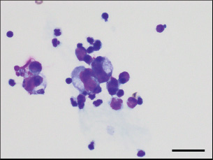 Fig. 3. Cytology of ascitic fluid sediment. The smear revealed low cellularity, with a few mildly degenerated neutrophils and macrophages. No evidence of neoplastic cells or bacterial infection was observed. Diff-Quik® stain, ×1,000. Scale bar=50 μm. As gross findings of the autopsy, severe ascites were seen, and a small amount of fibrin adhered to the serosal surface of the abdominal organs (Fig. 5A). The omentum, lesser omentum, and mesentery were thick and hard, with multiple nodule formations (Fig. 5B). The pancreas and upper small intestine were covered by these peritoneum tissues and formed a mass in the upper abdomen, resulting in loss of mobility. Numerous irregular nodules were observed on the abdominal wall and the ventral side of the diaphragm (Fig. 5C and D). Abdominal lymph nodes were not visible upon overall examination. Histopathologically, the pancreas exhibited infiltrative proliferation of tumor cells, forming ductal structures and sheets a proliferative pattern with necrosis in the center of the neoplastic tissue and partial mucus production, indicating a primary pancreatic tumor (Fig. 6A and B). In the omentum, lesser omentum, mesentery, and peritoneal wall, infiltrative proliferation of tumor cells with similar characteristics, mild presence of inflammatory cells, and remarkable fibrosis were observed (Fig. 6C and D). Metastatic lesions were observed in the abdominal wall, diaphragm, bladder serosa, and lungs. The neoplastic cells were positive for anti-cytokeratin AE1/AE3, anti-cytokeratin 7, and anti-cytokeratin 20, and negative for vimentin, suggesting that the neoplastic tissue differentiated into pancreatic exocrine cells, especially pancreatic ductal epithelial cells (Fig. 6E–G). Although these findings are consistent with the diagnostic criteria for exocrine pancreatic adenocarcinoma, the immunopositivity for cytokeratins 7 and 20 was approximately 20% or less (Cony et al., 2023). Neoplastic cells were negative for anti-WT1 antibody and Grimelius staining, ruling out mesothelioma and neuroendocrine tumors, respectively (Fig. 6H and I). The cat was ultimately diagnosed with cancerous peritonitis due to exocrine pancreatic adenocarcinoma, with suspected pancreatic ductal adenocarcinoma (T1N0M1). The pancreatic mass, along with the peritoneum exhibiting sclerosis and thickening resembling EPS, caused gastrointestinal ileus and severe ascites due to compression of the vascular system. Table 1. Details of primary antibodies and protocols for immunohistochemistry.