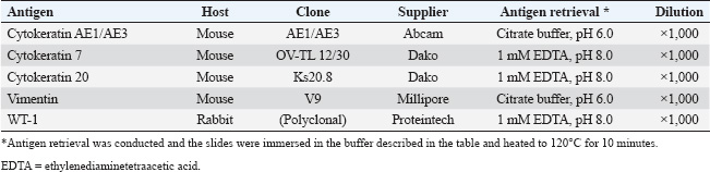 Fig. 2. Abdominal ultrasonography. Severe ascites were observed throughout the abdomen. (A) A hypoechoic irregular area (arrow) was observed in the left upper abdomen, which was considered to be an enlarged pancreas. (B) The peritoneum exhibited irregular thickening, with scattered hypoechoic nodular formations internally (arrowhead). Postmortem ExaminationsAfter obtaining the owner’s consent, a postmortem examination was performed on the day of death. The cat was submitted for autopsy, modified with cosmetic techniques. Sampling for histopathological examination was limited to the thoracic and peritoneal organs, including the thoracic trachea, lung, heart, spleen, esophagus, stomach, intestine, liver, pancreas, kidney, bladder, adrenal gland, coelomic lymph nodes, and coelomic serosa. The samples were fixed in 10% neutral-buffered formalin, routinely processed with paraffin, and finally embedded, sectioned, and stained with hematoxylin and eosin (HE) stain. Grimelius, Azan, periodic acid–Schiff, and immunohistochemical staining were performed to confirm tumor differentiation and fibrosis. The primary antibodies and antigen retrieval method are listed in Table 1. To prevent endogenous reactions, the deparaffinized sections were incubated with 0.5% hydrogen peroxide in methanol at 24°C for 20 minutes. After heat-induced antigen retrieval (citrate buffer, pH 6.0 or 1 mM EDTA, pH 8.0) by heating to 120℃ for 10 minutes, sections were incubated in Tris-buffered saline containing 5% skim milk at room temperature for 20 minutes to prevent non-specific reactions. Sections were incubated overnight at 4°C with primary antibodies, reacted with the secondary antibody Histofine MAX-PO MULTI (Nichirei, Tokyo, Japan) for 60 minutes at room temperature, and visualized using ImmPACT DAB (Vector Laboratories, Burlingame, CA, USA). The accuracy of each primary antibody reaction and Grimelius stain was evaluated by the positive reaction of the internal positive controls in the case.