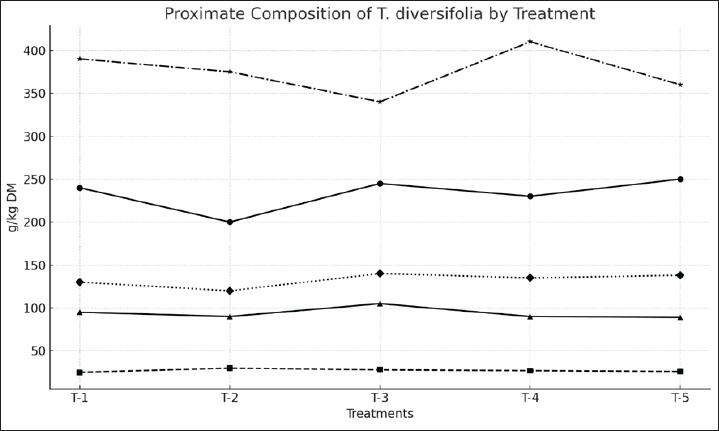 Fig. 2. Chemical composition of Tithonia diversifolia according to cutting age. Values represent means per treatment. CP: crude protein; EE: ether extract; NFE: nitrogen-free extract; AF, ash. Planting density of Moringa oleiferaNo significant statistical differences (p > 0.05) were observed between treatments for plant height, number of shoots, stem weight, number of leaves, leaf weight, total plant weight, or forage yield (t GF/ha and t DM/ha) in either of the two cuts. However, higher sowing densities were associated with higher forage yields. Nutrient composition values for CP ranged from 135 to 140 g/kg DM in all treatments, with no significant differences between sowing densities. DM was consistent (~187 g DM/kg GF), and NDF, FAD, and Hcell values did not differ significantly between the cuts or treatments. Table 4 presents the stomatological composition of M. oleifera harvested at two time points (90 and 90 days after the first cut) under three planting densities. No statistically significant differences (p > 0.05) were observed for any of the nutritional parameters (DM, OM, CP, NDF, ADF, and Hcell) across treatments or cuts. Crude protein values ranged between 135 and 140 g/kg DM, while NDF values remained around 340–355 g/kg DM. The dry matter content was stable (~187 g/kg as feed), and the hemicellulose content ranged from 6.2 to 7.3 g/kg DM. T-2 (80k plants/ha) tended to show slightly higher OM and CP values at both cuts, confirming a possible trend worth further exploration in future studies. Table 4. Dry matter (DM), organic matter (OM), crude protein (CP), neutral detergent fiber (NDF), acid detergent fiber (ADF), and hemicellulose (Hcell) from Moringa oleifera at two harvest times and three planting densities.