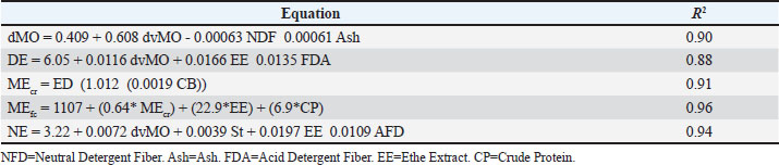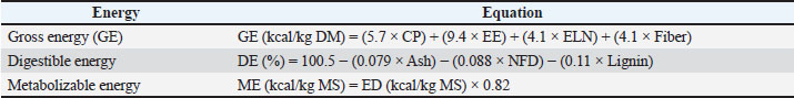 Cutting Height of Tithonia diversifoliaTo evaluate the cutting height in T. diversifolia, the experiment was conducted in a randomized complete block design with three treatments corresponding to the cutting heights: T1 (10 cm), T2 (25 cm), and T3 (40 cm), with four replications each. The first growth cycle lasted for 90 days, after which the plants were cut and regrown for another 90-day cycle before the second cut. Both cycles were independently evaluated. The experimental units consisted of 5 m² plots established under tropical agroecological conditions. Tithonia diversifolia cuttings that were uniform in size and previously rooted were used. Variables evaluated included plant height, number of shoots, fresh weight of leaves and stems, DM yield, and leaf proportion. For nutritional characterization, DM, CP, Ash, NFD, AFD, and Hcell were determined. Cutting frequency of Tithonia diversifoliaTo evaluate the frequency of cutting, an agronomic experiment was conducted to evaluate the effect of five cutting frequencies (T1=40, T2=45, T3=50, T4=55, and T5=60 days of regrowth age) on the variables DM yield and chemical composition. A homogenization cut was made in established crops, and 25 experimental plots of 25 m2 (5 × 5 m) each were delimited, five in each replicate, in which the five cutting frequencies were randomly distributed. Planting density of Moringa oleiferaThree densities were evaluated: T1=60 k, T2=80 k, and T3=100 k plants/ha, established in a completely randomized design with five replications. In both cases, plant height, number and thickness of stems, and weight of leaves and stems per plant were collected. Variables evaluated included plant height, number of shoots, fresh weight of leaves and stems, dry matter yield, and leaf ratio. DM, CP, Ash, NDF, AFD, and Hcell were determined for nutritional characterization. In vitro digestibility of Tithonia diversifolia and Moringa oleiferaThis study was carried out in the Ikiam biology laboratories using seven treatments based on formulated diets combined with different proportions of T. diversifolia (T2=5%; T3=10%; T4=15%) and M. oleifera meals (T5=5%, T6=10%, and T7=15%) and a control treatment (T1). The proximal chemical composition parameters of all treatments (DM, EE, CP, OM, NDF, AFD, and Hcell) were evaluated. The in vivo digestibility of OM (dMO) was estimated from the results of in vitro digestibility of OM (dvMO), digestible energy (DE), net energy (NE) (Noblet and Jaguelin-Peyraud, 2007), and ME for growing pigs (MEcr) (May and Bell, 1971) will allow estimation of ME for finishing fattening pigs (MEfc) (Noblet and Shi, 1993). Table 2 summarizes the regression equations employed to estimate the in vivo dMO, DE, and metabolizable energy (ME) for growing (MEcr) and MEfc based on in vitro results and stomatological parameters. These equations exhibit high coefficients of determination (R² ≥ 0.88), supporting their reliability for predicting energy values in monogastric nutrition trials (Noblet and Shi, 1993; May and Bell, 1971; Noblet and Jaguelin-Peyraud, 2007). Table 2. Regression equations were used to estimate the in vivo digestibility of organic matter (dMO), digestible energy (DE), and metabolizable energy for growing pigs (EMcr) and pigs finishing fattening (EMfc).