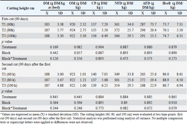 Statistical analysisThe statistical analysis was based on randomized block experimental designs to evaluate the effect of treatments such as cutting heights, sowing densities, and diet inclusion levels. For the comparison of means, ANOVA was applied when the data met the normality and homogeneity of variances assumptions. In cases where these assumptions were not met, as in the cut-off frequency effect analysis, the Kruskal–Wallis test was used, complemented by Dunn’s and Bonferroni’s tests for multiple comparisons. In the in vitro digestibility study of T. diversifolia and M. oleifera meal at different inclusion levels (5%, 10%, and 15%) in pig diets, the GLM was used to evaluate the effect of inclusion on the chemical composition, digestibility, and energy content of the treatments evaluated by the model: Yij=μ + Ti=1-7 + DIj=1-3 + Eij With Ti=1-7, the treatment (one vs. 2 vs. 3 vs. 4 vs. 5 vs. 6 vs. 7); DIj=1-3, the day of incubation (one vs. 2 vs. 3); ε, the experimental error. Dunnett’s C analysis was used to discern differences between treatments. Statistical significance in all studies was generally established at the p < 0.05 level. Data processing was performed using the R statistical package, and the statistical methods were adapted according to compliance with model assumptions. LimitationsThis study presents relevant findings on the agronomic performance, nutritional composition, and in vitro digestibility of Tithonia diversifolia and M. oleifera under Amazonian conditions. However, certain limitations should be acknowledged. Although in vitro digestibility techniques provide reliable estimates of nutrient availability and are widely used in early-stage evaluations, they do not fully replicate the complex physiological responses of live animals. Therefore, the absence of in vivo feeding trials limits the ability to validate the actual effects of the tested diets on animal growth performance, feed conversion, or gut health. In addition, the use of a controlled laboratory setting for digestibility assays may not capture the variability found under commercial or field conditions, including fluctuations in forage palatability, feed intake behavior, and microbiota interactions in monogastric animals. The scope of the study was also limited to a single geographical location and season, which may affect the generalizability of the results to other tropical regions or production systems. Future research should include controlled feeding trials to confirm the effects of T. diversifolia and M. oleifera inclusion on animal performance, as well as studies that explore the interaction of these forages with gut microbiota and animal health parameters under practical farm conditions. Ethical approvalNot needed for this study. The procedures performed in this study did not require animal intervention or manipulation. ResultsThe main effects and interactions of cutting the height of T. diversifolia, planting density of M. oleifera, and in vitro digestibility of both species are described below. Cutting height of Tithonia diversifoliaThe cutting height had a significant effect (p < 0.01) on several morphological and productive variables at the second cut. T-3 (40 cm cutting height) obtained the highest values in all evaluated variables: plant height, number of shoots, leaf weight, and forage yield in both fresh and dry matter. In contrast, T-1 (10-cm cutting height) had the lowest values among these variables. The stomatological components significantly differed in cutting height (p < 0.001). T-3 showed the highest crude protein and hemicellulose values and the lowest NDF and AFD values, showing better digestibility. The DM and OM levels were similar between the treatments. Table 3 summarizes the stomatological composition of T. diversifolia at two harvest times and three cutting heights. At the first cut (90 days), cutting height significantly influenced crude protein (p < 0.001), NDF (p < 0.001), and ADF (p < 0.001) contents. T-3 (40 cm) exhibited the highest CP (244 g/kg DM) and hemicellulose (83.5 g/kg DM) and the lowest NDF and ADF values (302 and 185 g/kg DM, respectively), indicating superior nutritive quality. These trends were consistent in the second cut (90 days after the first), where T-3 again showed elevated CP and reduced fiber fractions, reinforcing the forage quality advantage of higher cutting height. Table 3. Dry matter (DM), organic matter (OM), crude protein (CP), NDF, ADF, and Hcell of Tithonia diversifolia at two harvest times and three cutting heights.