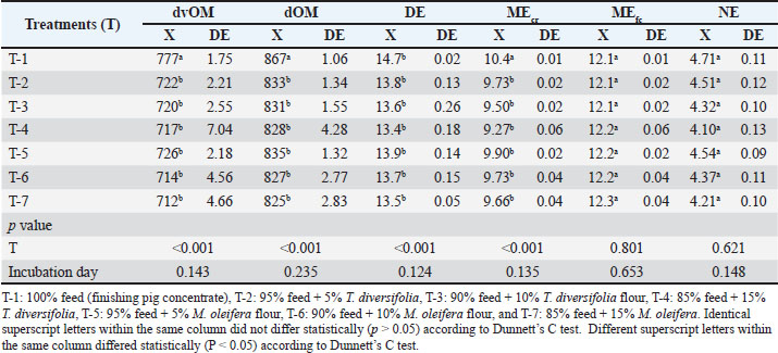 In vitro digestibility of Tithonia diversifolia and Moringa oleiferaStomatological analysis of the flours prior to formulation showed that T. diversifolia flour had higher CP (217 g/kg DM) and starch (173 g/kg DM) concentrations than M. oleifera (135 g/kg DM and 79.7 g/kg DM, respectively). Moringa oleifera also had higher EE (47.5 g/kg DM) and Hcell (75.3 g/kg DM) contents. T. diversifolia showed higher AFD (321 g/kg DM) and lower Hcell (43.1 g/kg DM) levels. Stomatological analysis of the experimental diets showed no significant differences (p > 0.05) in DM and OM between treatments. However, there were significant differences (p < 0.001) in NDF, SDF, Hcell, EE, and starch (St), with T-1 having the lowest fiber and the highest St values (Table 5). Table 5. Proximate chemical analysis of dry matter (DM, g/kg as feed), organic matter (OM), crude protein (CP), ether extract (EE), starch (St), neutral detergent fiber (NDF), acid detergent fiber (ADF), and hemicellulose (Hcell), (g/kg DM) of the studied treatments and of the T. diversifolia and M. oleifera flours (n=3).