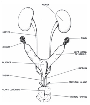 Fig. 1. Female rat urogenital system anatomy (Suckow et al., 2019). Rabbits, rats, mice, guinea pigs, dogs, fish, and non-human primates are all acceptable for use in preclinical studies. Nevertheless, rats (Rattus norvegicus) and mice (Mus musculus) are the most frequently utilized species due to their numerous morphological, physiological, genetic, and biochemical similarities to humans. Furthermore, these mammals are small, inexpensive to house, easy to obtain, capable of rapid growth, and can be modified at a minimal cost (Nascimento-Gonçalves et al., 2024). Rats undergo natural menopause between 18 and 24 months of age; therefore, ovariectomy is frequently used to induce menopause in experimental animals due to its advantages, including ease of application, reduced cost, and rapid onset of hypoestrogenism. Moreover, ovariectomy-induced menopause shows identical key characteristics to human menopause, including a similar hormonal profile, hypothalamic-pituitary-gonadal (HPG) axis dysregulation, and cognitive and cardiometabolic changes similar to those observed in menopausal women. The predominant rat strains utilized are Sprague-Dawley and Wistar rats, which show comparable responses to ovariectomy (Medina-Contreras et al., 2020; Yousefzadeh et al., 2020). Furthermore, vaginal and urethral tissue samples must be objectively analyzed for the histopathological alterations and therapeutic response in rats with GSM (Ho et al., 2009). This study aimed to provide comprehensive and precise guidance on how to perform ovariectomy and vaginectomy in rats to obtain ovarian, vaginal, and urethral tissue simultaneously while developing suitable animal model protocols. Materials and MethodsThis study used 40 female Wistar rats of R. norvegicus, each over 200 g, ethically sourced. An anesthetic protocol was administered using ketamine-xylazine at a dose of 40 mg/kg body weight by intraperitoneal injection before the ovariectomy. Subsequently, euthanasia was conducted at the conclusion of the protocol prior to the collection of vaginal and urethral tissue from the rats, utilizing ketamine-xylazine at five times the anesthetic dose (Soewondo et al., 2023). Ethical approvalThe research protocol was approved by the research ethics committee of the Faculty of Medicine, Sebelas Maret University, under the number 207/UN27.06.11/KEP/EC/2024. ResultsUrogenital system anatomy in female ratsIn female rats, the ovaries are located within the adipose tissue at the posterolateral pole of the kidneys and connected by the mesovarium to the abdominal cavity’s posterior wall. In mature ovaries, they form as a mass of follicles. The open end of the oviduct attaches to the ovary, while the distal end connects to the uterus. Despite the visible fusion of the uterine horns at the distal end, two different uterine ossa exist that lead into the vagina. Each uterus has an internum and an eksternum ostium and a cervical canal. The bladder empties into the urethra, which opens into the perineum at the base of the clitoris through the urethral orifice. The vaginal orifice is on the dorsal aspect of the urethra (Suckow et al., 2019; Herrera-Pérez et al., 2024). Ovariectomy techniquesThere are three ovariectomies techniques (Rejeki et al., 2018; Yousefzadeh et al., 2020; Herrera-Pérez et al., 2024):
