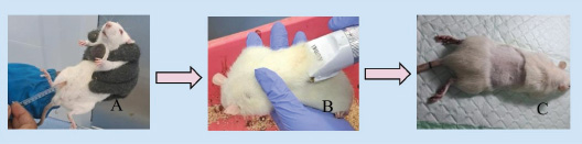 Fig. 2. Pre-operative stage (A) intraperitoneal anesthesia was administered to rats; (B) shaving the fur of the rat; (C) rats disinfected and ready for surgery.