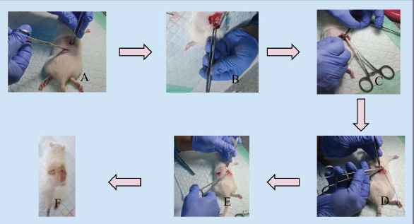 Fig. 3. Double dorsolateral incision ovariectomy (A) incision on the right dorsolateral; (B) visualization of the fat pad and ovary; (C) ligation and ovary removal; (D) suturing the muscle and skin of the rat; (E) the same procedure was performed on the contralateral ovary; (F) ovariectomy completed. C. Single midline dorsal incision ovariectomy