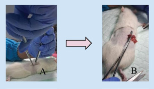 Fig. 4. Single midline dorsal incision ovariectomy (A) incision along the midline in the mid-dorsum area; (B) visualizing and removing the fat pad and ovaries using the previous method without creating additional incisions. D. Ventral or transverse incision ovariectomy