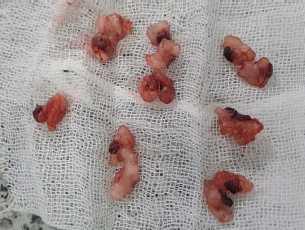 Fig. 5. Transverse incision slightly to the right in the central abdomen, followed by alternating ovaries removal using the same incision site as before.