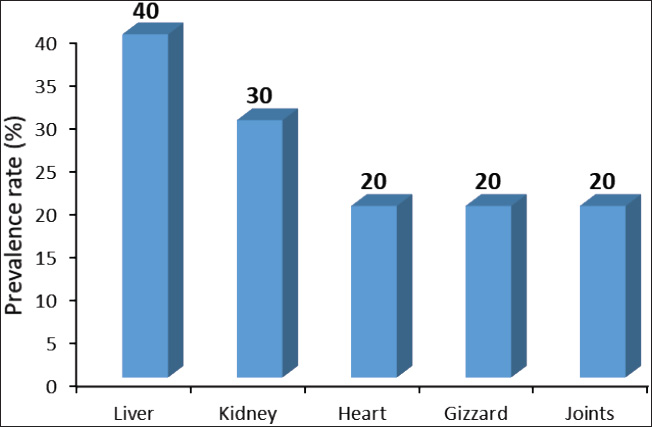 Fig. 1. Prevalence rate (%) of E. coli among different extraintestinal tissues of the examined pigeons.