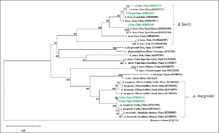 Fig. 1. Phylogenetic tree constructed based on A. capra gltA (594bp). The tree was constructed using the Neighbor-Joining method in MEGA 11, with 1000 bootstrap replicates. Rickettsia rickettsii (OR197735) was used as the outgroup. The sequences obtained in this study are highlighted in green in the figure. The groEL gene sequences (PQ851415, PQ851416, and PQ851417) and 16S rDNA sequence (PQ895775) shared 99.63%–100% identity with reference A. bovis sequences available in GenBank (S1). Phylogenetic analysis based on groEL sequences divided A. bovis into three clusters. The goat-derived sequence PQ851416 was grouped with isolates from South Korean black goats (MW122304, MW122305), while the cattle-derived sequence PQ851417 clustered with HbYS56 (OR555737), isolated from the Chinese H. longicornis. The goat-derived PQ851415 sequence was more closely related to PQ851417, forming a distinct branching node with it (Fig. 2).