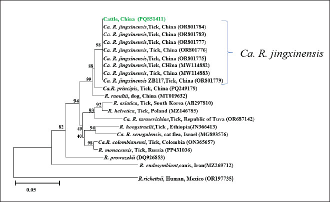 Fig. 4. Phylogenetic tree constructed based on SFGR ompA (532bp). The tree was constructed using the Neigh-bor-Joining method in MEGA 11, with 1,000 bootstrap replicates. The sequences obtained in this study are highlighted in green in the figure. DiscussionIn this study, we screened cattle and goats from the Dejiang region for Anaplasma spp. and Ca. R. jingxinensis, identifying several important Anaplasma species and providing the first global molecular evidence of Ca. R. jingxinensis infection in cattle. These findings highlight the need for sustained surveillance of Anaplasma and SFGR in local ruminant populations to prevent the emergence and spread of tick-borne diseases, which pose risks to both animal and human health. In this study, the overall infection rate of Anaplasma in cattle (29.41%) was found to be higher than previously reported across 12 provinces in China (13.2%) (Qiu et al., 2016). The overall infection rate in local goats (82.35%) was also markedly higher than that reported in Anhui (14.7%) (Wu et al., 2024), and Hainan (30.1%), but was consistent with a previously reported prevalence in Guizhou goats (79.31%) (Han et al., 2024). This regionally elevated prevalence may be attributed to the high abundance of R. microplus and H. longicornis in the region. Previous studies have shown that cattle and goats in this area are frequently infested with these tick species, facilitating Anaplasma transmission (Wang et al., 2021). Among the identified Anaplasma species, A. capra and A. bovis, goats exhibited significantly higher infection rates than cattle. Previous studies have not identified any host preference between these two pathogens in cattle and goats (Chimnoi et al., 2025), which may be related to local animal migration patterns and management practices. Locally, goats are typically grazed in the mountains for extended periods, resulting in a more complex range of activities, time, and habitats. In contrast, cattle generally graze on grasslands around farms, and their grazing time is shorter than that of goats because some are supplemented with artificial feeding. This difference in grazing behavior increases the likelihood of goats coming into contact with blood-sucking tick vectors. Anaplasma capra is a recently discovered zoonotic pathogen in China (Seo et al., 2020). It has been reported in several provinces across China, including Gansu, Guangxi, Guizhou, Chongqing, Shaanxi, Henan, Shandong, Hubei, Sichuan, Guangdong, Liaoning, Hainan, and the Qinghai-Tibet Plateau (Yang et al., 2017; Altay et al., 2024; Ma et al., 2024; Tang et al., 2024; Xue et al., 2024). Additionally, A. capra has been detected in various countries worldwide, including the Republic of Angola, Brazil, Kyrgyzstan, Greece, France, Sweden, Spain, South Korea, and Turkey (Calchi et al., 2020; Barradas et al., 2021; Jouglin et al., 2022; Remesar et al., 2022; Saratsis et al., 2022; Lysholm et al., 2023; Seo et al., 2023; Addo et al., 2024; Kim et al., 2024; Oguz et al., 2024). Anaplasma capra is transmitted by various species of hard ticks, which are widely distributed and can infect zoonotic hosts and domestic animals (Peng et al., 2018). It has been detected in 14%–18% of small ruminants, such as goats and sheep (Yang et al., 2017; Peng et al., 2018), and has also been reported to infect dogs, water buffalo, and cattle (Sahin et al., 2022). The gltA gene of A. capra appears to be particularly susceptible to variation driven by host factors. In this study, A. capra strains derived from cattle clustered into a distinct subclade, a phenomenon previously observed in other studies (Peng et al., 2018; Peng et al., 2021). However, the mechanisms underlying this variation and their potential biological impacts on the host require further investigation for a clearer understanding. In 2015, human cases of A. capra infection were first reported in China (Li et al., 2015). Infected individuals may present with symptoms such as fever, headache, malaise, dizziness, chills, nausea, vomiting, and diarrhea, as well as abnormal laboratory findings, including elevated liver transaminase levels, leukopenia, and thrombocytopenia (Altay et al., 2024). Although A. capra isolated in this study is distantly related to human isolates in the phylogenetic tree, there is currently no evidence to exclude its potential to infect humans. The potential risk of cross-species transmission should not be overlooked. Cattle and goats are primary reservoir hosts of A. bovis (Atif, 2016). Previous studies have reported A. bovis infection rates in animal hosts in China ranging from 4.5% to 49% (Guo et al., 2020), with infection rates in cattle in Japan (53%) (Ooshiro et al., 2008), South Korea (18.2%), and goats (0.5%) (Miranda et al., 2021). In this study, the infection rate of A. bovis in cattle (17.64%) falls within this range, although it is notably lower than that in goats (66.67%). Phylogenetic analysis revealed regional differences in A. bovis, suggesting the presence of distinct circulating strains in the area. We hypothesize that this diversity may be linked to the region’s intensive livestock trade, which hosts the largest cattle and goat trading market in northeastern Guizhou. The movement of animals likely introduces ticks carrying diverse A. bovis strains from different regions. Consequently, it is crucial to enhance public awareness of tick-borne pathogen control in livestock trade markets. Further epidemiological research is required to explore the relationship between livestock trade, strain transmission, and A. bovis genetic diversity. A. bovis has been identified as a zoonotic pathogen, with reported cases in regions such as Anhui, Jiangxi, and Ganzhou in China, as well as in the United States (Karpathy et al., 2023; Lu et al., 2019). Although most animals infected with A. bovis show no clinical symptoms, human infections may present with fever (up to 39°C), chills, headache, myalgia, anorexia, rash, cold sweats, di