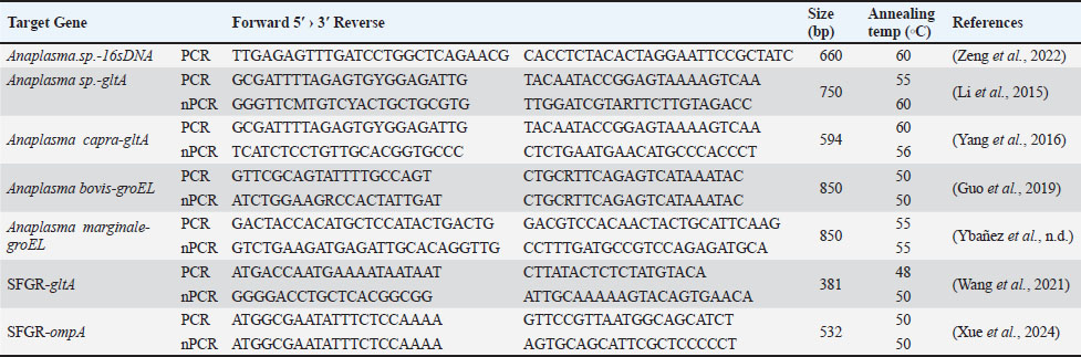 AbstractBackground: Anaplasma spp. and Candidatus Rickettsia jingxinensis have significant tick-borne zoonotic potential and cause diseases in both humans and domestic animals. Nevertheless, epidemiological data regarding their prevalence in cattle and goats within Dejiang County, China, are still limited. Understanding the local infections of these pathogens in domestic animals is crucial for assessing their potential spillover risk and informing public health interventions. Aim: This study aimed to determine the prevalence of Anaplasma and Candidatus R. jingxinensis in cattle and goats from Dejiang County, China, and assess the current infection rates and potential public health risks associated with these pathogens. Methods: A total of 170 domestic animal samples were collected. Following DNA extraction, polymerase chain reaction was employed to amplify pathogen-specific gene fragments of Anaplasma spp. and Candidatus R. jingxinensis, confirming their presence and constructing phylogenetic trees of the detected genotypes. Results: In this study, 35 out of 119 cattle were infected with Anaplasma, of which three species, including A. capra, A. bovis, and A. marginale, were identified with infection rates of 9.24% (95% CI:5.24%–15.80%,17.65%(95% CI: 11.84%–25.48%), and 26.89% (95% CI: 19.74%–35.49%), respectively. A total of 48 goats (82.35%, 69.75%–90.43%) were infected by Anaplasma, of which two species, A. capra and A. bovis, were identified with infection rates of 62.75% (95% CI: 49.03%–74.68% and 66.67% (95% CI: 52.97%–78.03%), respectively. No goats were infected with A. marginale. Furthermore, 4 (3.36%, 1.31%–8.32%) cattle were infected with Ca. R. jingxinensis. This is the first time that molecular evidence of this organism has been detected in cattle. Notably, double and triple infections with these agents were found in cattle, and coinfections were detected in goats. Conclusion: Anaplasmosis is highly prevalent in local ruminants, particularly in goats. The pathogen species distribution differs between hosts, with A. marginale showing host specificity for cattle. The detection of Ca. R. jingxinensis in cattle suggests an expansion of its host range. These findings highlight the need for enhanced surveillance and control measures for these pathogens, especially considering the potential spillover risks and public health threat. Keywords: Dejiang, Tick-borne zoonotic pathogens, PCR, Cattle, Goat. IntroductionAnaplasma and Spotted Fever Group Rickettsiae (SFGR) are key members of the Rickettsiae group, primarily transmitted by hard ticks to animal hosts. Infections caused by these pathogens can lead to rickettsial diseases, which have substantial implications for both veterinary and public health (Rar and Golovljova, 2011; Salje, 2021). Anaplasma refers to a group of small, highly diverse, intracellular, gram-negative bacteria that primarily parasitize eukaryotic cell cytoplasm, forming mulberry-like inclusions (Rar et al., 2021). At least seven species of Anaplasma, including A. phagocytophilum, A. bovis, A. marginale, A. centrale, A. platys, A. ovis, and A. capra, are recognized as causative agents of anaplasmosis in hosts. Five of these species (A. phagocytophilum, A. bovis, A. ovis, A. capra, and A. platys) can cause disease in humans (Akwongo and Byaruhanga, 2024). Anaplasma infections are highly infectious to ruminant livestock, such as cattle and sheep, potentially leading to anaplasmosis. The presence of anaplasmosis within a herd can result in a 20%–30% loss in body weight, abortion, or even maternal death, as well as a 30% increase in natural culling rate of the herd, causing significant economic losses (Goodger et al., 1979). The financial burden of Anaplasma infections on cattle farms has been estimated at $352.70 to $727.70 per cow (Akwongo and Byaruhanga, 2024). In the United States, the economic impact of Anaplasma infections on California’s livestock industry has been estimated at $11 million (Goodger et al., 1979). Notably, anaplasmosis in humans often presents with mild or nonspecific symptoms, which can lead to misdiagnosis as other infectious diseases (Sanchez et al., 2016), frequently resulting in the disease being overlooked. However, an increasing number of cases have been reported in countries such as China, South Korea, Japan, Poland, and Belgium (Yang et al., 2017; Wang et al., 2020; Schudel et al., 2024). Therefore, clinicians and veterinarians working in endemic areas should remain vigilant in recognizing and managing this disease. Candidatus Rickettsia jingxinensis is a newly discovered SFGR species with potential zoonotic risks. It was first identified in 2016 in Haemaphysalis longicornis ticks (Liu et al., 2016). Research on Ca. R. jingxinensis has involved a wide range of hosts, including humans, companion animals (e.g., dogs and cats), and pangolins. In contrast, reports of Ca. R. jingxinensis in domesticated, economically important ruminants (e.g., cattle and goats) are scarce. Given the potential health risks to ruminant livestock and the associated agricultural losses, continued surveillance and focused investigations are necessary. Dejiang County, located in the northeastern part of Guizhou Province in southwestern China, lies at the confluence of the Wuling and Daloushan Mountain Ranges. The region possesses a diverse and resource-rich ecosystem, providing an ideal environment for cattle and goat farming. According to data from the People’s Government of Dejiang County, by the end of 2024, there were 65 livestock farms in the county, each with more than 100 cattle. Additionally, the number of cattle-raising households reached 43,800. The total cattle inventory is expected to be 175,600 head, with 61,400 head slaughtered annually, generating an annual output value exceeding $ 209 million (Dejiang County People’s Government Portal, 2024). Previous studies have reported that Guizhou Province is home to at least 19 tick speci