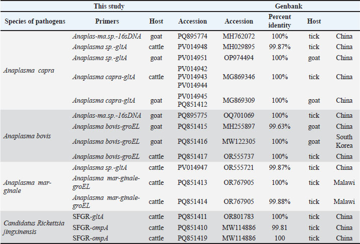 Genetic and evolutionary analysisThe PCR products were electrophoresed on a 1.5% agarose gel, and the UV imaging system was used to visualize the bands. If more than 10 positive bands were detected, 50% were randomly selected and sent to Chongqing BGI for Sanger sequencing. If fewer than 5 positive bands were detected, all were subjected to sequencing. The obtained sequences were compared with gene sequences registered in the GenBank database using the BLAST tool from the National Center for Biotechnology Information (NCBI). Representative sequences were selected, and a phylogenetic tree was constructed using the neighbor-joining method with 1,000 bootstrap replicates in MEGA 11 software. Statistical analysisCount data are presented as numbers (%, 95% CI). The 95% confidence intervals (95% CI) were calculated using the Wilson score method, which provides more accurate interval estimates, especially for small sample sizes or proportions close to 0 or 1. The chi-square test (χ²) was used to compare differences in pathogen positivity rates between and within the cattle and goat groups. Fisher’s exact test was applied when the chi-square test assumptions were not met. A significance level of 0.05 was used for all analyses. Statistical analyses were conducted using the SPSS 27 software. Ethical approvalThe Animal Care Welfare Committee of Guizhou Medical University approved this study (Ethical Approval No. 2305072). All animals were handled in accordance with the Animal Ethics Procedures and Guidelines of the People’s Republic of China. ResultsRates of Anaplasma and SFGR infectionsOut of the 119 cattle screened by PCR, 35 (29.41%, 95% CI: 21.97%–38.14%) were infected with Anaplasma and 4 (3.36%, 1.31%–8.32%) were infected with Ca. R. jingxinensis. Sequencing identified the genotypes of Anaplasma: A. capra in 11 cattle (9.24%, 95% CI: 5.24%–15.80%), A. bovis in 21 cattle (17.64%, 95% CI: 11.84%–25.48%) and A. marginale in 32 cattle (26.89%, 95% CI: 19.74%–35.49%) (Table 2). Among the infected cattle, 12 (10.10%, 95% CI: 5.86%–16.80%) were infected with a single pathogen, 16 (13.45%, 95% CI: 8.45%–20.73%) were co-infected with two pathogens, and 8 (6.72%, 95% CI: 3.45%–12.71%) were infected with three pathogens (Table 3). The infection rate of A. marginale was significantly higher than that of A. capra (χ2=12.52, p < 0.001), whereas no significant differences were observed between A. marginale and A. bovis (χ2=2.94, p=0.087) or between A. bovis and A. capra (χ2=3.61, p=0.057). Table 2. Overall Prevalence of Anaplasma and Ca. R. jingxinensis in cattle and goat.