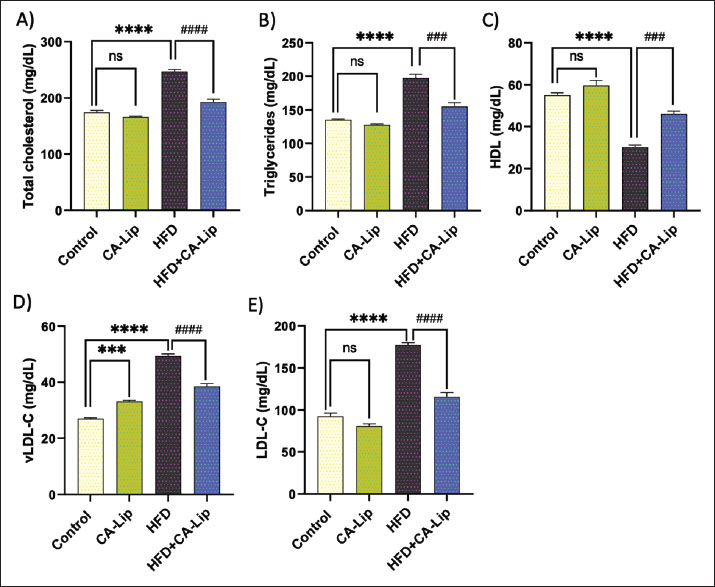 Fig. 4. Influence of CA-Lip on serum lipid profile. The levels of TC (A), TGs (B), HDL (C), VLDL-C (D), and LDL-C (E) were measured for the different groups. ****p < 0.0001, ***p < 0.001, ####p < 0.0001 versus HFD group, ns indicates nonsignificant. Data are presented as the mean ± SEM (n=10). CA-Lip suppresses proinflammatory cytokines in HFD-fed ratsThe present research identified several significant proinflammatory cytokines associated with obesity. The pro-inflammatory cytokines TNF-α and IL-6 had significantly higher (p < 0.05) levels in rats on an HFD. They were significantly suppressed (p < 0.05) by CA-Lip administration (Fig. 5A and B). These findings imply that CA-Lip could reduce systemic inflammation driven by obesity.