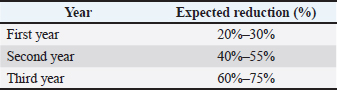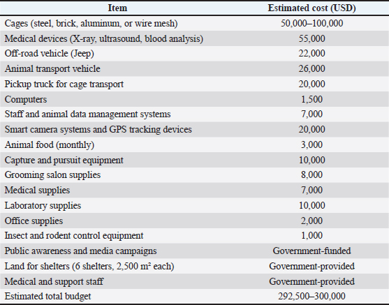 Phase three: evaluation and sustainabilityThis stage aims to maintain a control rate of no less than 70%, with a goal of reaching 80%, especially if permanent centers are established that comply with international standards (Table 3). Table 3. Staff and operational system (Per Shelter, Per Shift).