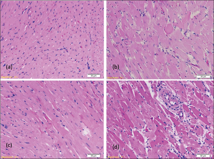 Fig. 2. (a) Control group: myocardium of the left ventricle of the rat; HE, 200×; (b) hyperthermia-41 group: rat left ventricular myocardium: second degree with multiple myocardial cell damage (in the central part of the photomicrograph), HE, 20×; (c) and (d) heat stroke-44 group: rat left ventricular myocardium: second degree with greater focal myocardial cell damage, HE, 20×. In a semiquantitative analysis of myocardial lesions caused by exposure to water temperatures of 41˚C and 44˚C, we analyzed the type and extent of myocardial changes in rats in experimental groups depending on the target water temperature and exposure duration. No signs of damage to individual cardiomyocytes were observed in rats, aligning with the first degree in the severity classification of myocardial alteration. More pronounced injury, ranging from focal to locally extensive cardiomyocyte damage consistent with third-degree changes, was detected in 2 rats from the heat stroke-44 group. No myocardial samples from any experimental group exhibited pathological features corresponding to fourth-degree changes (Table 3). Table 3. Frequency of rats in experimental groups according to the intensity of tissue changes.