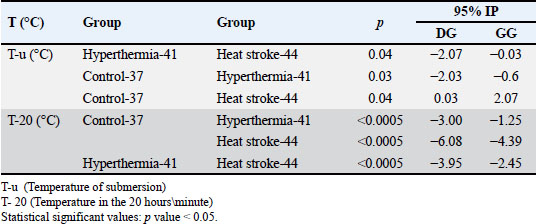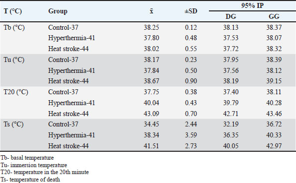 Table 2 shows only significant differences in the body temperatures of rats in the observed groups, and significant temperature differences occurred mostly after 20 minutes of exposure and death. Table 2. Differences in the body temperature values of the rats of the experimental groups at the time points.