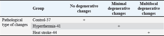 Analyzing the type of changes in the experimental groups, similar types of changes were observed depending on the experimental groups. Analyzing the extent of the changes, damage to individual cardiomyocytes and gentle damage to individual cardiomyocytes in the Hyperthermia-41 and Heat stroke-44 groups were observed, with sometimes greater focal damage to cardiomyocytes in the Heat stroke-44 group changes, while the other groups (Hyperthermia-41, Heat stroke-44) developed minimal and multifocal degenerative changes, sometimes with mineralization (Table 4). Table 4. Pathological type of changes.