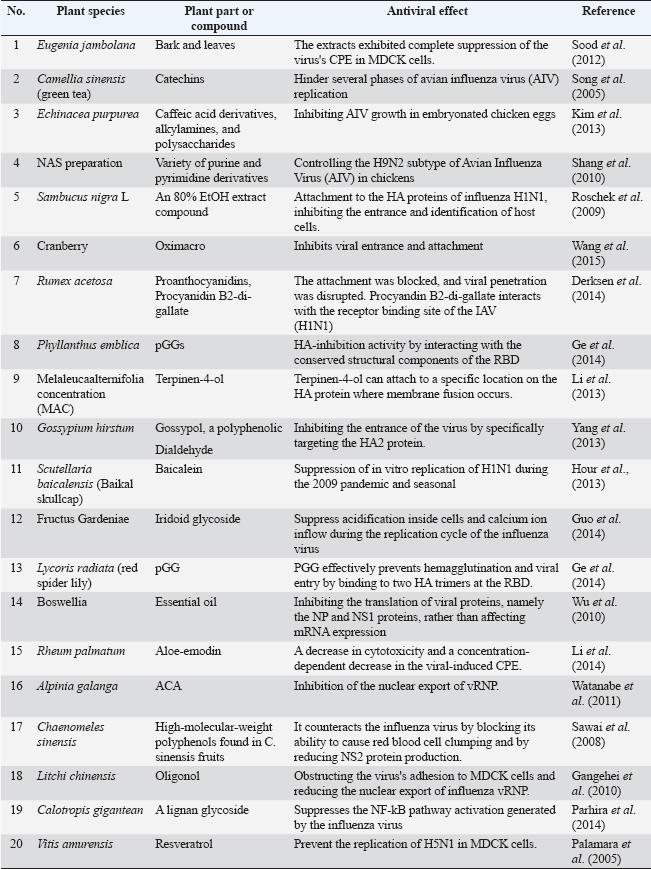 ABSTRACTMedicinal herbs have long been used for their ability to manage viral infections and other diseases. Plants are beneficial for treating several bacterial and viral infections in humans and animals. Plants play a crucial role in providing pharmacological and medicinal products due to their capacity to produce chemicals with antiviral properties via secondary metabolism. This could reduce the need for chemotherapy treatments in poultry. Recent research indicates that natural products have a significant promise as a source of novel antiviral agents. Additional ethnobotanical research and laboratory experiments are being conducted to identify plants with the potential to enhance avian influenza virus and Newcastle Disease management. This review sheds light on plants exhibiting antiviral effects against avian influenza virus and 21 Newcastle disease viruses. Keywords: Avian influenza virus, Newcastle disease virus, Management, Herbal plants. IntroductionViruses have a substantial mutation rate, resulting in the constant appearance of novel strains that are resistant to antiviral treatments. Thus, it is crucial to consistently investigate and create novel antiviral substances. In recent decades, there has been a growing interest in the quest for plant-derived pharmaceutical compounds that might effectively combat animal viruses with high fatality rates or that result in significant economic losses. The poultry business is a crucial agricultural sector that supplies food to approximately 7 billion people globally. The demand for chicken meat has been consistently rising and is projected to reach 131,607 thousand tons by 2026. The chicken business is affected by a range of pathogenic microorganisms, including viruses, bacteria, and protozoa. The most formidable diseases among them are viral infections that persist via genetic modifications, such as mutations, recombinations, or co-evolution with vaccinations (Yasmin et al., 2020). Although vaccinations have proven effective in managing several viral infections, some diseases may only be managed with the use of antiviral chemotherapy. The acceptance of antiviral medications has been gradual, mostly due to the toxicity associated with the previous generations of these agents. Unlike the progress made in the creation of antibiotics, efforts to create antiviral medications have encountered several challenges. Viruses rely only on cellular metabolic processes, which means that they have a restricted number of enzyme systems and building components that may be targeted by drugs. In addition, unlike a substance that inhibits the growth of bacteria, a potent antiviral medication must not only exhibit significant selectivity in its ability to combat viruses but also permanently hinder viral replication to prevent cell death caused by the viral infection and promote the resumption of normal cellular processes. A significant number of infectious viral illnesses continue to result in substantial fatality rates. Despite significant advancements in antiviral chemotherapy, there is a continuing need for antiviral medicines. The emergence of drug-resistant viruses during treatment is a possible obstacle to successful therapy. In addition, novel viral pathogens may be identified. Over a considerable period of time, phytochemicals have been recognized for their ability to suppress viruses. These antiviral chemicals may be obtained from sources, such as higher plants, which have been far less investigated than conventional sources for different reasons. The first antiviral medication with clinical efficacy was methylisatin-thiosemicarbazone (Methisazone), which showed effectiveness in treating dermatitis vaccinatum and preventing smallpox, particularly the smallpox virus. Methisazone, administered at a dosage of 25 mg/kg, exerted inhibitory effects against the variola virus. Subsequently, it was effectively used for treating dermatitis vaccinatum and as a preventive and therapeutic measure against smallpox. The proliferation of drug-resistant viruses in medical therapy is a significant challenge for achieving successful therapeutic outcomes. In addition, novel viral pathogens may also be discovered. Consequently, there is a significant need for readily available antiviral drugs that are affordable and have low adverse effects. Therefore, exploring traditional medicines as potential new antiviral agents is essential, given that several ancient remedies, which consist of various plant metabolites, have strong antiviral properties (Mukherjee, 2019). This review will discuss the antiviral effect of herbal plants against the most severe avian infections affecting the poultry industry caused by viruses, including the avian influenza virus (AIV) and Newcastle disease virus (NDV). The AIVThe Orthomyxoviridae family includes the AIV. The virus encodes at least 11 proteins through its negative, single-stranded, eight-segmented RNAs. Virus subtypes are defined by the surface hemagglutinin (HA) and neuraminidase (NA) proteins, which are in charge of virus attachment and release, respectively (Abdelwhab and Hafez, 2012). Based on its disease-causing potential in chickens, the virus is classified as either highly pathogenic AIV (HPAIV) or low pathogenic AIV. Numerous subtypes of AIV, such as H5, H7, and H9, co-circulate, rendering the vaccine useless. Hence, vaccination against several HA subtypes is essential. Immunological pressure, which accelerates the virus’s evolution rate, is another factor that reduces vaccination effectiveness (Yasmin et al., 2020). Table 1 summarizes the antiviral activity of some medicinal plants against AIV in birds. Eugenia jambolanaEugenia jambolana is a large perennial. Therapeutic compounds in tree bark and leaves may be used to treat chronic diarrhea, dysentery, sore throat, and bacterial and viral infections. The antiviral activity of crude leaf and bark extracts against HPAIV H5N1 was tested. The extracts completely suppressed the 