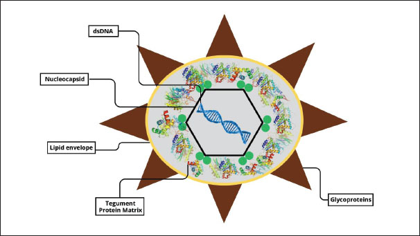 Fig. 1. Schematic representation of MDV morphology. The genus Mardivirus comprises three recognized species: MDV-1 (Gallid herpesvirus 2, serotype 1), MDV-2 (Gallid herpesvirus 3, serotype 2), and MDV-3 (Meleagrid herpesvirus 1, commonly known as Turkey herpesvirus or HVT, serotype 3). Although these species are serologically related, they differ markedly in virulence, host range, and vaccine application. MDV-1 includes all virulent and oncogenic strains, ranging from mild (mMDV) to virulent (vMDV), highly virulent (vvMDV), and very virulent plus (vv+MDV) pathotypes, and is the primary causative agent of Marek’s disease in chickens (Ongor et al., 2022; Liu et al., 2023). MDV-2 consists of naturally occurring, non-oncogenic strains that do not cause disease but are used in bivalent vaccines, often combined with HVT, to enhance protection (Bell et al., 2019). MDV-3 or HVT, a non-oncogenic virus naturally found in turkeys, is widely used as a heterologous vaccine against MDV-1 and is known for its safety and effectiveness in poultry immunization (McPherson and Delany, 2016). Over the past five decades, MDV-1 has shown a clear evolutionary trend toward increasing virulence, with shifts from mMDV to vMDV in the late 1950s, vMDV to vvMDV in the late 1970s, and vv+MDV emergence in the early 1990s (Davison and Nair, 2005). These changes have necessitated the continuous development of more potent vaccines to maintain effective disease control in poultry populations. Virus life cycleCalnek (2001) proposed a widely referenced model of the MDV life cycle, outlining the key phases of viral infection and transmission. This model describes the progression from initial infection to the development of an infectious virus in the epithelial cells of feather follicles. The four main interconnected stages of the MDV life cycle are as follows: (i) entry, (ii) replication, (iii) latency, and (iv) dissemination. Inhalation of dust containing infectious virus particles is the first step in contracting MDV (Kennedy et al., 2017). Early viral replication has been observed in the lungs of B cells and macrophages of infected animals (Bertzbach et al., 2020). Phagocytic cells, including macrophages, transport the virus to the spleen, bursa of Fabricius, and regional lymphatic tissue, where it infects additional immune cells (Davison and Nair, 2005). Both in vitro studies and infections in chickens have demonstrated that macrophages and DCs facilitate MDV replication and cell-to-cell transmission (Chakraborty et al., 2017). MDV secretes a viral CXC chemokine that was formerly known as vIL-8 but was more recently renamed vCXCL13 due to its biological characteristics (Engel et al., 2012). These chemokines are crucial for the normal infection establishment pathway because they attract B cells and some CD4+ T cells (Hughes and Nibbs, 2018). It is only found between days 4 and 10 post-infection, and the overall percentage of lytically infected cells in the primary lymphoid organs of infected hens is often rather low (1.2%) (Berthault et al., 2018). Virus replication occurs in multiple cell types during chicken infection, with B cells accounting for most infected cells (Bertzbach et al., 2020). Infected B cells are the cells most vulnerable to lytic replication and are easily identified in infected chickens (Schat, 2022). MDV produces a viral CXC chemokine, originally designated vIL-8 and more recently renamed vCXCL13 based on its biological properties (Engel et al., 2012). This chemokine plays a pivotal role in the early stages of infection by recruiting B lymphocytes and subsets of CD4+ T cells to sites of viral activity (Hughes and Nibbs, 2018). vCXCL13 expression is transient, typically detectable only between 4 and 10 days post-infection, during which the proportion of lytically infected cells in primary lymphoid organs rarely exceeds 1.2% (Berthault et al., 2018). Viral replication occurs in various cell types within the host, but B lymphocytes are the predominant and most susceptible population for lytic replication, making them readily identifiable in infected chickens (Bertzbach et al., 2020; Schat, 2022). Although B cells are important for early stages of MDV replication, recent studies indicate that they are not essential for subsequent tumor formation or later stages of pathogenesis (Yang et al., 2020). MDV can still efficiently replicate in CD4+ and CD8+ T cells in the absence of B cells (Bertzbach et al., 2018a). Emerging evidence suggests that the virus may replicate in other lymphocyte subsets, such as natural killer (NK) cells, which are part of the innate immune system and are known to produce IFN as an antiviral response (Bertzbach et al., 2019). However, the role of NK cells in MDV pathogenesis remains under investigation, and current data should be interpreted cautiously. Interferon production by NK cells and other immune cells inhibits MDV replication and reduces disease progression (Kamble et al., 2023). Primary chicken endothelial cells have also been identified as potential targets for MDV infection (Hagag et al., 2020). Recent findings challenge the earlier view that MDV infection follows a strictly sequential process, significantly expanding our understanding of the cell tropism of the virus (Vychodil et al., 2022). In addition to replicating, MDV causes T cells to go into latency (Arumugaswami et al., 2009). Lethal lymphoma results from the conversion of only a small number of latently infected cells (Mallet et al., 2022). MDV incorporates its viral genome into the telomeres of host chromosomes in tumor cells and latently infected cells (You et al., 2021a). This integration is necessary for T-cell transformation and guarantees the preservation of the viral genome and its oncogenes (Tien et al., 2023). Telomere integration is facilitated by the placement of telomeric repeats at the ends of the viral genome, most likely via the homologous recombination route (Kheimar et al., 2017). The quick deve