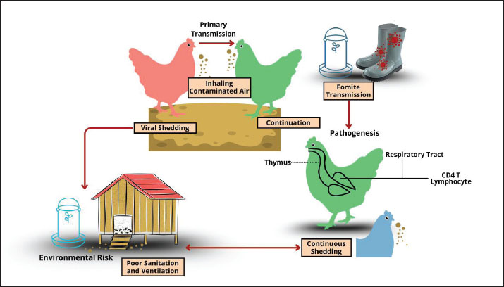 Fig. 3. MDV transmission in chickens. Risk factorsMD risk factors are directly linked to the chicken’s age, immune condition, maintenance system, and virus virulence degree. The most vulnerable are very young chicks, particularly those in the first few weeks following hatching, as their immune systems are still developing and cannot mount a sufficient defense (Zhu et al., 2024). Given that dust particles and epithelial debris from virus-carrying feather follicles can survive in these conditions for weeks or even months, the danger is also increased when hens are housed in high-density, unsanitary, and inadequately ventilated situations (Woźniakowski and Samorek-Salamonowicz, 2014). Furthermore, the virulent level of circulating MDV strains significantly influences the pattern of illness incidence and severity; even in vaccinated chickens, very virulent (vvMDV), and very virulent plus (vv+MDV) strains can cause large levels of mortality (Liu et al., 2023). Another significant risk factor is the chicken’s immune condition, particularly if it has been exposed to other immunosuppressive substances, such as Newcastle disease and infectious bursal disease viruses, which can weaken the body’s defenses against MDV infection (Schat and Skinner, 2014). Genetic influences cannot be overlooked because chickens from lines with poor genetic resistance are more prone to MD than those from lines with higher genetic resistance (Chang et al., 2014). The danger of MD emergence and development in a population depends heavily on the intricate interplay between the genetic background of the chickens being reared, their age, management and biosecurity practices, immunological status, and the degree of viral virulence (Chu et al., 2019). Economic impactPrior to the development of vaccinations, MD posed a significant financial risk to the chicken industry, leading to mortality rates of up to 60% and 10% in laying and broiler flocks, respectively (Dejyong et al., 2023). Although sporadic losses still occur because vaccinations are not 100% effective, they are no longer a significant concern (Atkins et al., 2013). The projected cost of fatalities and mortality in the United States because of MD in 1984 was approximately $12 million. When broken down by category, the financial burden of MD includes the following: (i) decreased egg production, which directly reduces revenue from laying hens; (ii) decreased feed conversion rate, leading to higher feed costs for the same weight gain; and (iii) increased vaccination and biosecurity expenses, which significantly add to production costs. The total economic impact is approximately $169 million in the US and $943 million globally when these losses are included (Dunn and Gimeno, 2013). Recent global estimates suggest that current losses, combining mortality, reduced productivity, and prevention measures, are between $1 and $2 billion annually, although these numbers cannot be confirmed (Zeghdoudi et al., 2023). The poultry industry continues to be very concerned about MDV due to its unpredictable outbreaks and the potential for vaccines to eventually fail due to the emergence of more virulent MDV strains (Yu et al., 2023). In Ethiopia, MD was initially identified in 1983, and between 1983 and 1986, a 3% incidence rate was noted in industrial chicken farms (Getahun, 2023). MD may be important for contemporary chicken production in Ethiopia, as evidenced by the high mortality rate (46%) in commercial poultry farms during an outbreak in central Ethiopia (Demeke et al., 2017). During this outbreak, mortality alone resulted in an estimated financial loss of 76,000 birr over 3.5 months, without accounting for production losses or prevention costs. Ethiopian chickens are not currently vaccinated against MD, despite its economic importance in Ethiopian chicken production (Duguma et al., 2005). TreatmentThere is no proven specific treatment for MD, particularly in hens that already have neoplastic tumors or clinical signs. MDV is a DNA herpes virus that can live and conceal itself in lymphoid cells, making it challenging for antiviral treatment to reach these cells (Lopez et al., 2019). Consequently, prevention rather than therapy, specifically through vaccination and the application of stringent biosecurity protocols, is the best control strategy (Reddy et al., 2017). VaccinationThe vaccination works quite well; in commercial settings, it frequently provides more than 90% protection (Baigent et al., 2007). Turkey strain FC-126 herpesvirus is commonly used and works very well against aggressive MDV (Calderón et al., 2022). Bivalent vaccination that combines serotype-2 strain SB-1 with HVT works in concert to offer superior defense against virulent MDV (Neerukonda et al., 2019). Since immunity develops in 2 weeks and handling of the chicks is not necessary, in-ovo vaccination is the preferred method (Abd El-Ghany, 2025). MDV has developed greater virulence and resistance to these vaccinations, as they do not stop viral infection. Therefore, the current vaccines are combination vaccinations that employ either an attenuated strain of MDV, CVI988/Rispens, or HVT and Gallidherpesvirus type 3 (Sadigh et al., 2018). Widespread vaccination significantly reduced illness losses by more than 99% and provided hosts with another crucial tool against the virus (Atkins et al., 2013). Many nations have implemented the attenuated form of MDV, CVI988, which is considered the best protective vaccine currently available (Ralapanawe et al., 2016). The MDV vaccination is given in the ED in vivo. The vaccine inoculum is automatically injected into the amniotic fluid of most eggs (Williams and Hopkins, 2011). However, this illness presents a significant threat to the chicken industry and complicates management measures due to rising vaccination failure rates and the appearance of increasingly aggressive pathogens. MD vaccination has numerous intrinsic flaws despite its effectiveness rate of over 95