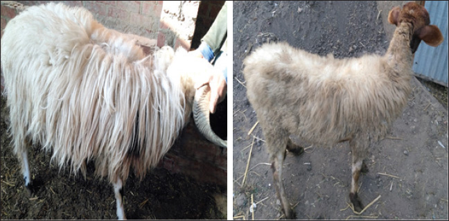 Fig. 4. Sheep suffering from diffused alopecia. Our study revealed that the mean body temperature, heart rate, respiration rate, and ruminal movement were 38.5ºC, 90/minutes, 30/minutes, and 1/2 minutes, respectively. Our results were in conformity with the data acquired by Sobiech and Kuleta (2002), who indicated that sheep showed normal appetite, whereas in our experiment, there was a decrease in sheep appetite. Because of anemia caused by a lack of Cu and iron, the mucous membrane was paler than usual. Although our investigation found negative interior and external parasites as well as a lack of Cu and iron, pale mucous membranes, and anemia severity are linked to gastrointestinal nematodes. Alopecia, parakeratosis, alterations in the coat (steely wool), a minor decrease in appetite, a drop in body weight gain, locomotor disruption, and anxious symptoms were among the other clinical indicators displayed by the afflicted sheep. Similar findings have been documented in other related studies (Abd El-Raof and Ghanem, 2006; Aitken, 2008).