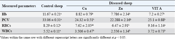 Our study revealed a significant decrease in hematological parameters (Hb, RBCs, WBCs, and PCV). This decrease might be due to a disturbance in the regular metabolism of iron as Cu deficiency decreases the absorption of iron, releasing of iron from body stores, and utilization in Hb synthesis (Abd El-Raof and Ghanem, 2006; Pond et al., 2004). However, this could be linked to a decrease in the level of serum ceruloplasmin, which moves iron from intestinal and liver storage cells to transferase in the plasma. Enzyme transferase reduces the release of iron from typically damaged erythrocytes and delivers iron to the bone marrow for Hb synthesis (Sharma et al., 2005; Kaneko et al., 2008). In the current study, normochromic normocytic anemia was detected in the blood of the affected sheep. The low serum Cu levels suggest that the ewes were fed a low-concentration diet (Pugh and Baird, 2012; Smith, 2014). Furthermore, increasing calcium and phosphorus consumption is the primary cause of Zn deficiency in sheep because it reduces Zn absorption. According to the current clinical assessment, most farmers only feed sheep large concentrations of grains, especially barley, which may cause a Zn shortage. The mean mineral value results of the current study are consistent with those published by Pugh and Baird (2012). The role of trace elements in hematopoiesis and immunity is responsible for this hematological change. Hypochromic microcytic anemia develops in the advanced stages of hypocuprosis due to poor iron absorption and Hb synthesis failure. In addition, Gehrke et al. (1998) noted that Fe is not used in Hb formation and stays in the liver until Cu is given, when anemia results from either a Cu or Fe deficit. Anemia results from hypocuprosis because less iron is released, which reduces the amount of iron available for erythropoiesis and many other processes. Cu is required for iron to be properly distributed, absorbed, and released throughout the body. Therefore, for erythropoiesis, there is less Fe available. Cu status also affects the Heinz body count and Hb concentration (Lukaski, 2004; Murray et al., 1999). In conclusion, the substantial reduction in the hematological picture highlights the critical role of trace elements in hematopoiesis, as demonstrated subsequently by serum analysis. Cu-dependent enzymes help to maintain the red cell membrane and allow iron absorption and hemosynthesis. This outcome was also reported by Mohammed et al. (2013) and Al-Nakeeb et al. (2016). Table 4. Hematological parameters in apparently healthy sheep and sheep with trace element deficiency.