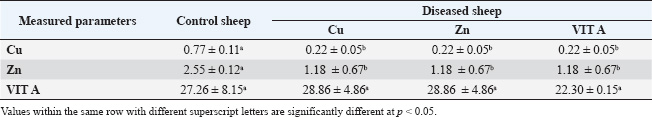 ABSTRACTBackground: A number of elements are essential for the body, including zinc (Zn), copper (Cu), vitamin A, and vitamin E. Nutritional deficiency diseases (ND diseases) are ailments that reduce the amount of animals produced, restrict commerce, and can result in severe economic losses. Mineral deficiencies, whether primary or secondary, create significant obstacles in livestock production because they are associated with decreased productivity, reproductive issues, and various health complications. Aim: This study aimed to determine the levels of Zn, Cu, and vitamin A, as well as the clinical signs, hematological, biochemical, and antioxidant changes that may occur due to the nutritional deficiencies of such trace elements and vitamin A in sheep. Methods: Several blood parameters were measured in normal or nutritionally deficient sheep. Such parameters included hematological levels, glucose, total protein, albumin, globulin, and oxidative stress GSH-Px, SOD, and CAT. This study was conducted on 100 sheep (male and female). Eighty sheep suffered from Zn, Cu, and vitamin A deficiency, and 20 were clinically healthy and served as the control group. Results: The diseased animals had the following clinical signs: depression, pica, pale mucous membrane, loss of hair around the eye, ear, and nose, erected wool, easily detached wool, depigmentation of the coat with apparent alopecia, decreased body weight gain with normal or decreased appetite. Some sheep were suffering from gait stiffness and parakeratosis with a marked increase in heart and respiratory rates, with normal body temperature. The obtained results showed significant decreases (p < 0.05) in Hb, PCV, RBCs, and WBCs in addition to significant decreases (p < 0.05) in glucose and total protein. Significant decreases in the levels of antioxidant enzymes (GSH-Px, CAT, and SOD) were also recorded. Conclusion: These results indicate that nutritional deficiencies of the trace elements Zn, Cu, and vitamin A make sheep liable to several skin disorders. Therefore, dietary supplementation of such macro and micro-elements is highly recommended to avoid such adverse effects. Keywords: Nutritional deficiencies, Zinc, Copper, Vitamin A, Skin disorders, Sheep. IntroductionSheep are responsible for 40% of cash income and 19% of household meat consumption. The most common sheep breeds in Egypt are the Rahmani, Ossimi, and Barki varieties, which account for approximately 65% of the livestock population in Egypt. According to Tefera (2004), they play a significant role in the production of wool, which is used in the leather industry and the production of meat. The skin performs several functions, including acting as an enclosing barrier, providing protection from the environment, regulating temperature, producing pigment and vitamin D, and providing sensory perception. The skin is the largest and heaviest single organ in the body, accounting for 12%–24% of an animal’s total body weight. The skin is much more than just an outer covering. According to van Beeck et al. (2015), its purpose is to keep the body in a state of homeostasis despite the daily assaults that come from the outside. Protein, vitamin A, vitamin E, essential fatty acids (EFAs), zinc (Zn), and copper (Cu) are some of the nutrients that can affect the skin and hair coat health of an animal. The coat of an animal is a reflection of its overall health and nutrition (Postnov et al., 2022). Any factor that affects the body has a direct effect on wool production, such as any systemic disease, stress, or nutritional deficiency that leads to wool weakening and fiber thinning, which causes wool breakage at any weak point. Skin diseases have a significant impact on the efficiency and quality of sheep wool production, which is an essential product for the sheep industry (Scott, 2015). Skin diseases resulting from different causes mostly present with a similar clinical appearance. The veterinarian must use a systemic approach to successfully detect skin problems and arrive at an accurate diagnosis by obtaining a complete history, performing a thorough physical examination, and using one or more simple diagnostic techniques (Carmalt et al., 2004). Infectious causes include parasitic causes (lice and mange), fungal infestation (ringworm), and viral infection (papillomatosis, lumpy skin disease, and contagious pustular dermatitis) (Prohic et al., 2022). According to Kusiluka et al. (1996), skin destruction caused by all infectious agents, including external parasites, fungi, bacteria, and viruses, results in a loss of mechanical protection between the animal and its environment. In turn, this makes it easier for other diseases to infiltrate the animal, which can have a negative impact on the animal’s overall health. Additionally, nutritional deficiencies, such as Cu, Zn, and vitamin A, can affect the skin and wool of animals. The proportions of various components, including proteins, lipids, minerals, and vitamins, affect the structure of wool. According to Ambilo and Melaku (2013), wool quality is indicated by its fiber diameter, yield, crimp, color, and strength. Any disruption in these nutrients can affect the skin’s barrier function and immune protection. Clinical signs of nutritional deficiencies in animals include diarrhea, anemia, alopecia, depigmentation, seborrhea, hyperkeratosis, parakeratosis, anorexia, fertility problems, development problems in young animals, decreased production, tetany, decreased protein synthesis, immune system insufficiencies, and pica (Antoniou et al., 2022). The term “Cu deficiency” refers to a condition in which the body is unable to absorb Cu in the digestive tract for a variety of reasons, the most important of which is the interplay between Cu, molybdenum, and sulfur. Copper thiomolybdate (CuMoS4) is formed when these three elements bind to each other, which prevents Cu from being absorbed and leads to the subsequent problem. In addition, its def