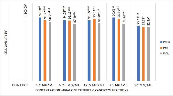 Fig. 1. Effect of three P. canescens leaf fractions at concentrations of 3.1, 6.25, 12.5, 25, and 50 µg/ml on RAW 264.7 cell viability. A distinct superscript in each bar (p < 0.05) indicates a significant difference between the means. Effect of P. canescens fractions on the phagocytic capacity of RAW 264.7 cellsThe RAW 264.7 cells treated with LPS at both concentrations, 1.25 and 2.5 µg/ml, showed significantly higher phagocytosis percentages (139.50% ± 24.43% and 175.20% ± 16.28%) compared to the control group (11.35% ± 0.46%, p < 0.05). RAW 264.7 cells treated with PcEA at concentrations from 1.56 to 25 µg/ml showed phagocytosis capacities ranging from 50.39% ± 17.61% to 81.40% ± 4.84%. RAW 264.7 cells treated with PcB showed phagocytosis rates ranging from 30.23% ± 1.34% to 43.41% ± 4.84%, while PcW treatment resulted in rates ranging from 29.46% ± 6.71% to 43.41% ± 1.93%. Figure 2 demonstrates the effect of P. canescens leaf fractions on the phagocytic activity of RAW 264.7 cells.