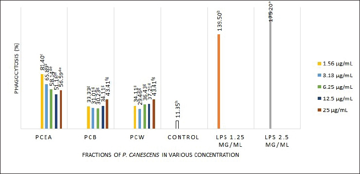 Fig. 2. Effect of three P. canescens leaf fractions at concentrations of 3.1, 6.25, 12.5, 25, and 50 µg/ml on RAW264.7 cell phagocytic capacity. A distinct superscript in each bar (p < 0.05) indicates a significant difference between the means. Effect of P. canescens fractions on RAW 264.7 cell NO productionIn this study, LPS induction at a concentration of 2.5 µg/ml in RAW 264.7 cells significantly increased NO production by almost 13 times compared with the untreated cells (p < 0.05). NO production was significantly higher when RAW 264.7 cells were incubated with the three P. canescens fractions at 1.56 µg/ml compared with the control group (p < 0.05). Notably, following treatment with 1.56 µg/ml of PcEA fraction, NO production was higher than that in the group exposed to LPS of 2.5 µg/ml. Conversely, a contrary outcome was observed in RAW 264.7 cells, which were incubated with PcEA at a dosage of 3.13 µg/ml, where NO production was considerably lower than that of the control group. However, this difference was not significant (p > 0.05) (Fig. 3). These findings demonstrate that the concentration of the samples significantly affects the NO production from RAW 264.7 cells treated with the three P. canescens fractions.