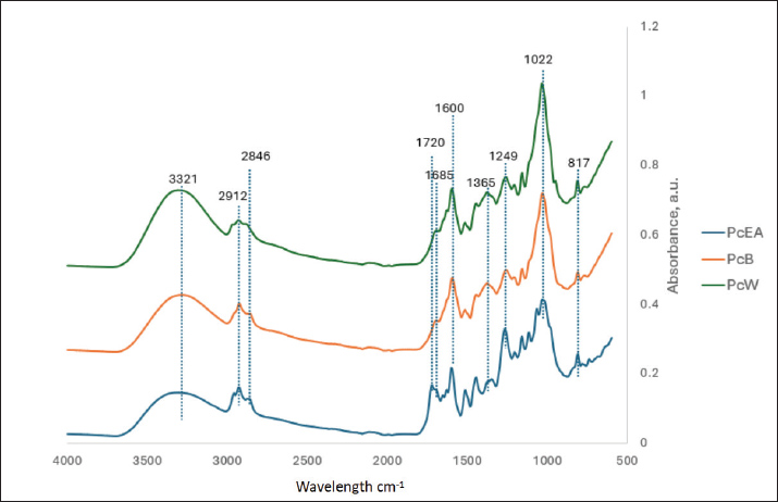 FT-IR spectroscopy analysisThe FT-IR spectra are shown in Figure 4. The three fractions of P. canescens leaf extract exhibited several similar absorption peak patterns, indicating the existence of common functional groups. A broad absorption peak near 3,250–3,475 cm−1 indicates absorption from the hydroxyl group, whereas the absorption peak around 3,321 cm−1 denotes stretch from the secondary amine (NH) group. The appearance of spectral peaks at 2,912 and 2,846 cm−1 indicates the stretching vibrations of the CH group. The carbonyl group (C=O) appears at an absorption peak of 1,720 cm−1. This C=O group is more abundant in the water fraction (PcW), which is characterized by its greater intensity. The peak at 1,685 cm−1 signifies the C=C stretching group, whereas the peak at 1,600 cm−1 denotes the NH (amide) group. Peak 1,022 cm−1 shows that the C-O group is stretching, whereas peak 1,249 cm−1 confirms that the C-O group could be from phenol. The absorbance peak at 1,365 cm−1 indicates CH bending groups from alkanes, while the peak at 817 cm−1 indicates wagging from CH2.