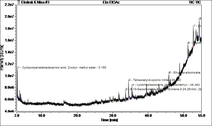 Fig. 5. Chromatogram of the PcEA fraction of P. canescens leaves based on GC-MS. Table 3. Compounds identified from the PcEA fraction of P. canescens leaves based on GC–MS analysis.