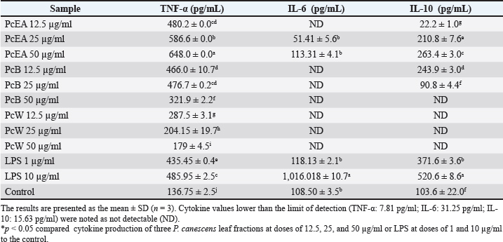 Fig. 3. Effect of three P. canescens leaf fractions at concentrations of 3.1, 6.25, 12.5, 25, and 50 µg/ml on NO production in RAW 264.7 cells. A distinct superscript in each bar (p < 0.05) indicates a significant difference between the means. Effect of P. canescens fractions on RAW 264.7 cell cytokine productionThe impacts of RAW 264.7 cells exposed to PcEA, PcB, and PcW at the concentrations of 12.5, 25, and 50 µg/ml on cytokine production, including TNF-α, IL-6, and IL-10, are shown in Table 2. Table 2 shows that the cultures of RAW 264.7 cells treated with LPS at dosages of 1.25 and 2.5 µg/ml, as well as those incubated with all three P. canescens fractions at concentrations ranging from 12.5, 25, and 50 µg/ml, markedly enhanced the release of the cytokine TNF-α in comparison to the control group (p < 0.05). Meanwhile, the release of IL-6 cytokines by RAW 264.7 cells treated with PcEA at 25 and 50 µg/ml dosages, along with the group stimulated by LPS at 1 µg/ml, showed no significant difference compared with the control cells. Elevated production of the cytokine IL-10 was noted in RAW 264.7 cells treated with PcEA at doses ranging from 12.5 to 50 µg/ml and PcB at concentrations from 12.5 to 25 µg/ml, in addition to RAW 264.7 cells stimulated by 1 and 10 µg/ml LPS. Table 2. Effect of three P. canescens leaf fractions at doses of 12.5, 25, and 50 µg/ml on the production of cytokines in RAW 264.7 cells.