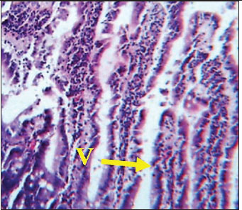 Fig. 2. Histological section of male rat small intestine treated with L-arginine stained with Hematoxylin and Eosin (H&E), showing villus structure at 40x magnification using light microscopy. Histological analysis of spleenHistological examination of the splenic tissue of rats treated with L-arginine showed notable pathological alterations. These included: Congestion of blood vessels within both the red and white pulp and lymphoid hyperplasia in the white pulp, indicating increased proliferation of lymphoid cells, suggestive of immune stimulation or chronic inflammation (Fig. 4). In contrast, the spleen from control male rats exhibited normal histological architecture. The white pulp and red pulp regions were clearly distinguishable. Central arteries and blood vessels appeared unremarkable, and no signs of congestion, inflammation, or hyperplasia were observed. The lymphoid follicles within the white pulp were of normal size and density (Fig. 3)