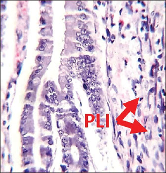 Histological analysis of intestineSections from rats treated with L-arginine showed clear histopathological alterations. Notably, perivascular lymphocytic infiltration was observed, along with the presence of plasma cells (Fig. 2), indicating an inflammatory response. The integrity of the mucosal structure appeared disrupted compared to the control, indicating tissue injury and immune cell recruitment as a result of L-arginine administration. In contrast, the intestinal section from male rats in the control group demonstrated normal histoarchitecture. The villi (V) in (Fig. 1) appeared long and slender, extending deeply into the tunica mucosa. The epithelial lining and lamina propria appeared intact, with no evident signs of cellular infiltration or tissue disruption.