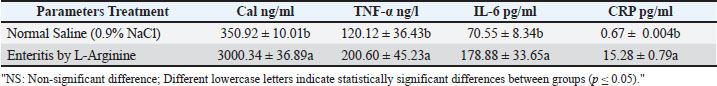 Serum inflammatory markersSerum levels of calprotectin, IL-6, TNF-α, and CRP were significantly elevated (p ≤ 0.05) in the enteritis group compared to controls (Table 4). Table 4. Mean of Calprotectin, IL-6, TNF-α and CRP between studied groups.