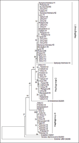 Results: Seventeen mutation sites were identified in the Cyt-b region. Consequently, four haplotypes (H) of Cyt-b were identified: H1 (56%), H2 (22%), H3 (17%), and H4 (5%). The haplotype diversity (Hd) and nucleotide diversity (pi) for the partial Cyt-b analyzed were 0.645 ± 0.081 and 0.003 ± 0.001, respectively. Phylogenetic tree analysis indicated that the swamp buffaloes in Sijunjung Regency were classified within Haplogroup 1 and exhibited close genetic ties to buffaloes from South Asia (Bangladesh), Southeast Asia (Thailand, Laos, Vietnam, Philippines), and East Asia (Taiwan, China). No evidence of genetic introgression from Indian and Pakistani buffaloes was found in the studied population.