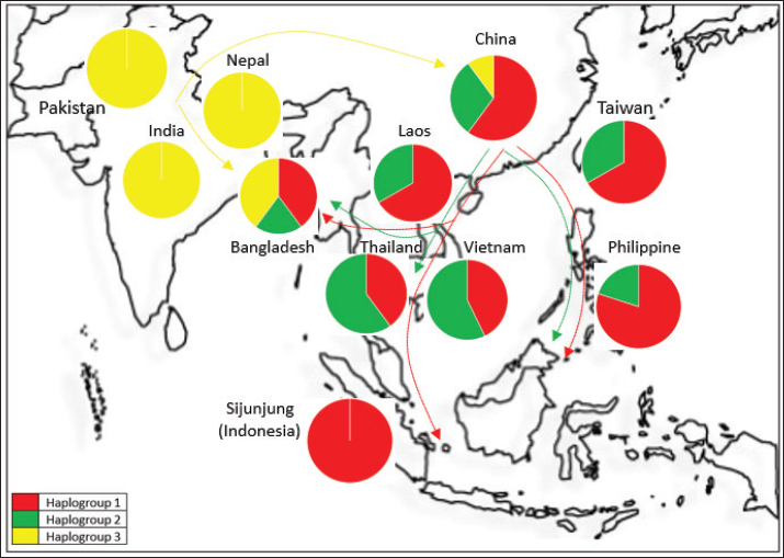 Conclusion: The matrilineal origin of buffaloes in Sijunjung Regency may be traced back to the southeastern Chinese buffalo (Lineage A) via two migration routes: the land-bridge (China - IndoChina - Malaya Peninsula - Sumatra) and the insular pathway (China - Taiwan - Philippines - Borneo - Sumatra).