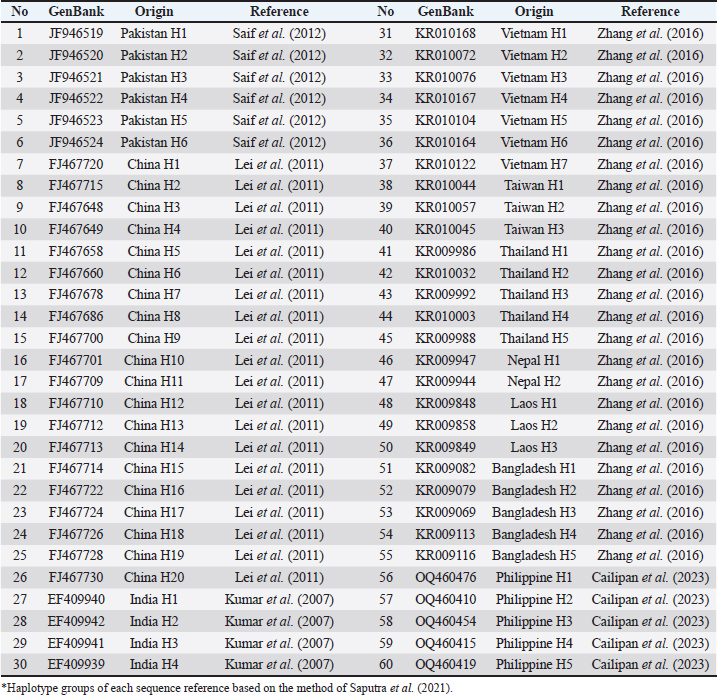 In mammals, the origin of maternal lineage can be predicted through the diversity of the cytochrome b (Cyt-b) region (Tobe et al., 2010). Cyt-b is a gene that plays a role in electron transport within the respiratory chain. It serves as a target for evolutionary analysis and species identification, which is particularly beneficial for comparing species within the same genus or family (Bruford et al., 2003). Besides, the Cyt-b gene has been used mostly for studying the evolution and genetic relationships of mammals, including buffalo (Yue et al., 2013; Sukri et al., 2014; Rusdin et al., 2020; Sun et al., 2020; Saputra et al., 2021).