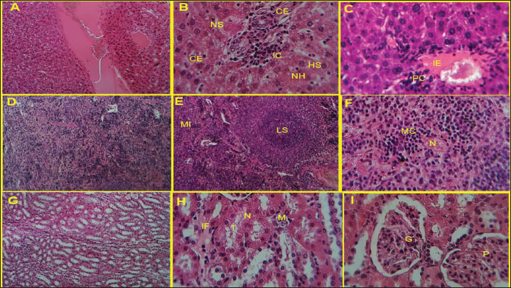 Fig. 3. Microscopic assessment of control, immunized, and non-immunized groups at 28 days post-infection with P. aeruginosa H and E stain (400, 100X). (A) The control group had no liver lesions. (B) The liver of the KWSPAgs immunized group showed severe inflammatory reaction with infiltration of inflammatory cells (IC), necrosis of hepatocytes (NH), narrowing of sinusoidal (NS), and hepatocyte swelling (HS). Cellular edema (CE) was severe and there was a slight vacuolar fatty change. (C) The liver of the immunized group had perivascular cuffing (PC) followed by inflammatory edema (IE), central vein distension, and few mononuclear cells. (D) Control group with no lesion in spleen tissue. (E) Infected group with a reactive lymphoid follicle, white pulp with a prominent necrotic area of lymphoid tissue suppuration (LS). The white and red pulp has mononuclear cells infiltrating it (MI). (F) Mononuclear cell infiltration with two foci of CFU (MC) in spleen with small area of necrotic lesion (N). (G) Kidney of control group with no lesion. (H) Kidney tissue of infected group with edematous fluid between tubules (IF) with mononuclear cells infiltration (M) and narrowing of distal and proximal tubules (T) and some of it with coagulative necrosis (N). (I) Kidney of immunized group, the cortex showed hypertrophy in glomeruli (G) with polymorphic cells infiltration (P). Nanoparticles increased the efficacy of KWSPAg delivery, leading to significant changes in immune histochemistry biomarkersThe results of our study have shown that immune histochemistry staining of the liver and lung of naive and immunized groups at 28 days post-infection with P. aeruginosa. Naive immunohistochemistry sections showed negative staining cells, whereas the immunized group showed potent positive staining represented by pink-red-brown cells (black arrow) and scattered pink-red-brown cells (yellow head arrow). Immunohistochemical staining of the naive, KWSPAgs and KWSPAgs+NPs Figure 4A–F.