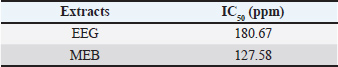 In vitro antioxidant activityThe antioxidant activities of the extracts were quantified using the DPPH radical scavenging assay, as indicated by their IC550 values. The MEB exhibited an IC50 of 127.58 ppm, suggesting moderate antioxidant strength. In contrast, the EEG has an IC50 of 180.67 ppm, indicating weaker antioxidant capacity (Table 5). Table 5. In vitro antioxidant activity by DPPH assay.